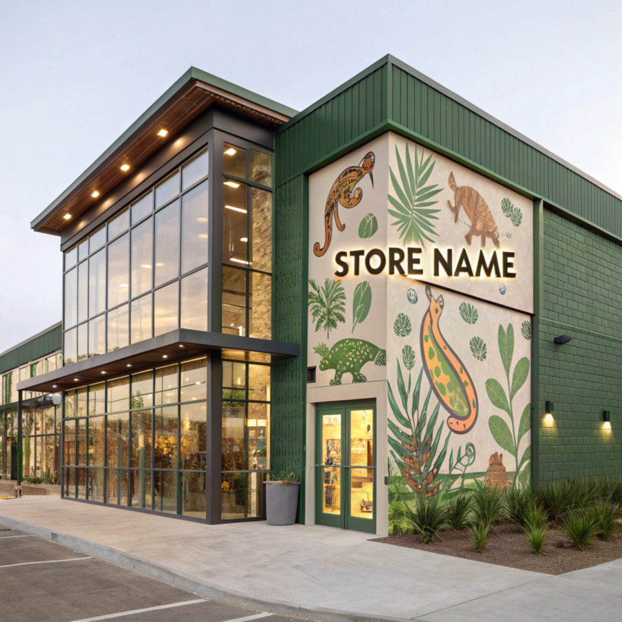 - Images of Reptiles and Amphibians: Murals or large decals on the walls depicting colorful reptiles, amphibians, and other exotic animals. This could include images of chameleons, geckos, frogs, snakes, and turtles. - Plants: Potted plants and hanging vines near the entrance add a touch of greenery and create a welcoming atmosphere. - Signage: A prominent sign with the store’s name in bold, eye-catching letters. The font should be playful yet legible, perhaps incorporating stylized animal shapes.