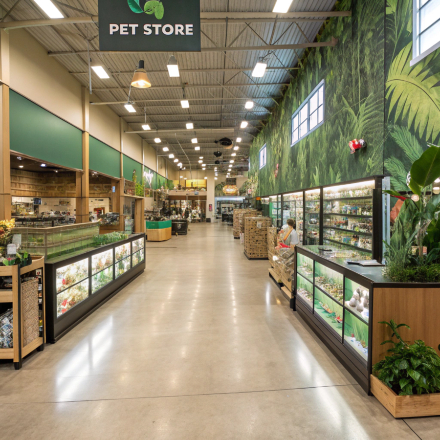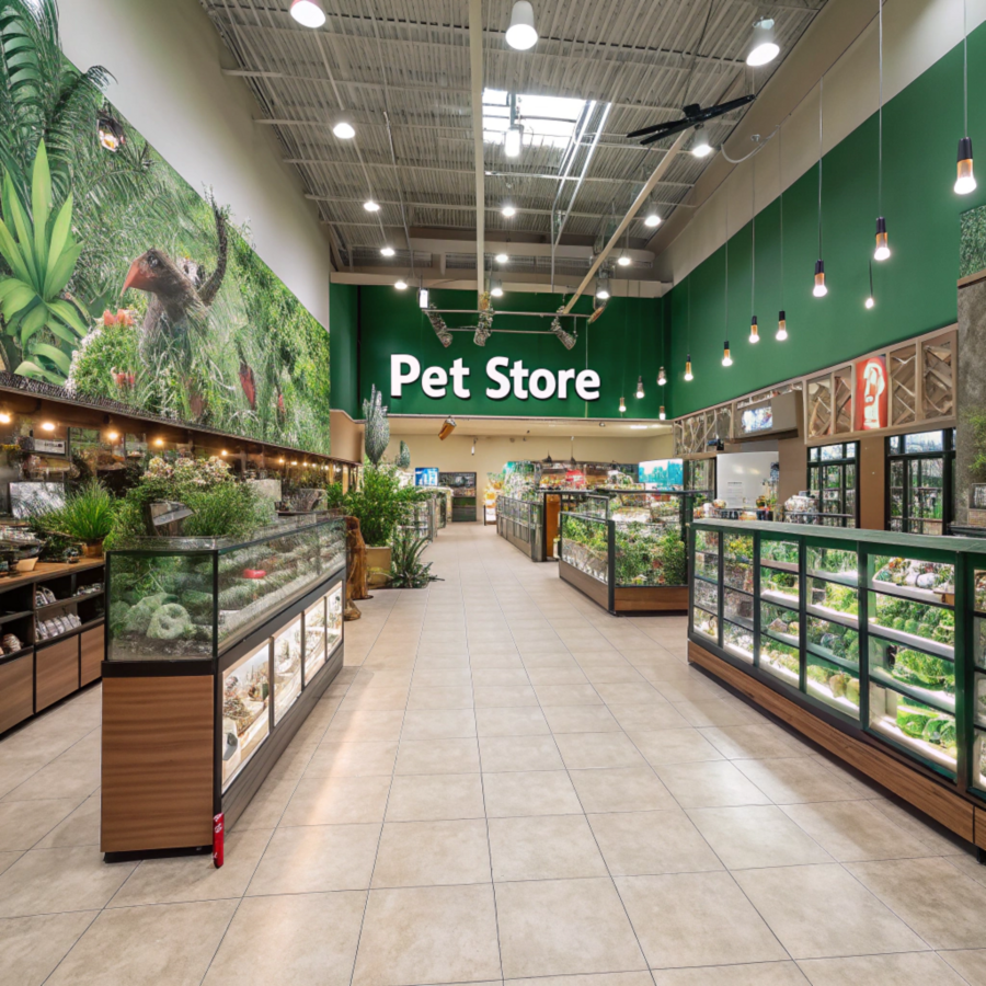 - Green Accents: Green is used throughout the store to create a natural, jungle-like atmosphere. This includes green paint on the walls, potted plants, and leaf-patterned fabrics. - Murals: Murals depicting rainforests, deserts, and other habitats where these animals naturally reside. These can cover entire walls, creating an immersive experience. - Lighting: Soft, warm lighting that mimics natural sunlight. Spotlights highlight specific display cases and merchandise.