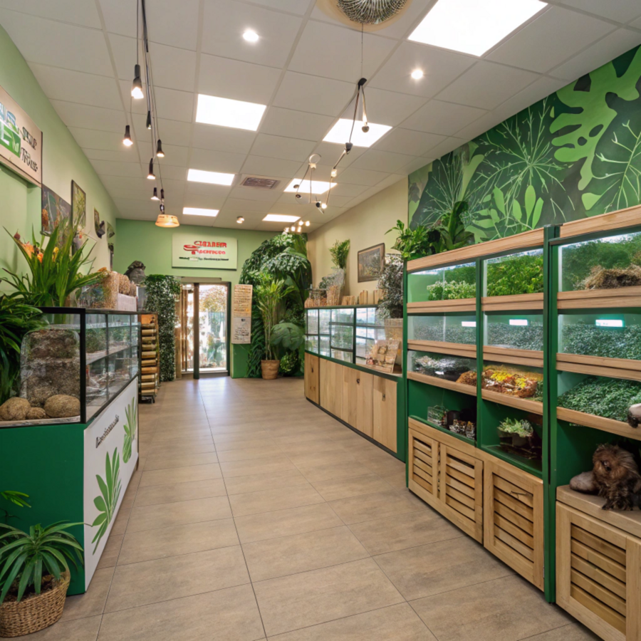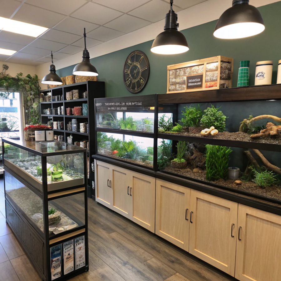 - Terraiums: A variety of terraiums in different sizes and styles, ranging from simple glass tanks to elaborate custom-built habitats. - Feeding and Care Products: Shelves stocked with high-quality feeds, supplements, vitamins, and other necessities for keeping reptiles and amphibians healthy. - Accessories: Various accessories such as heating lamps, water filters, substrates, and decorative items for terraiums.