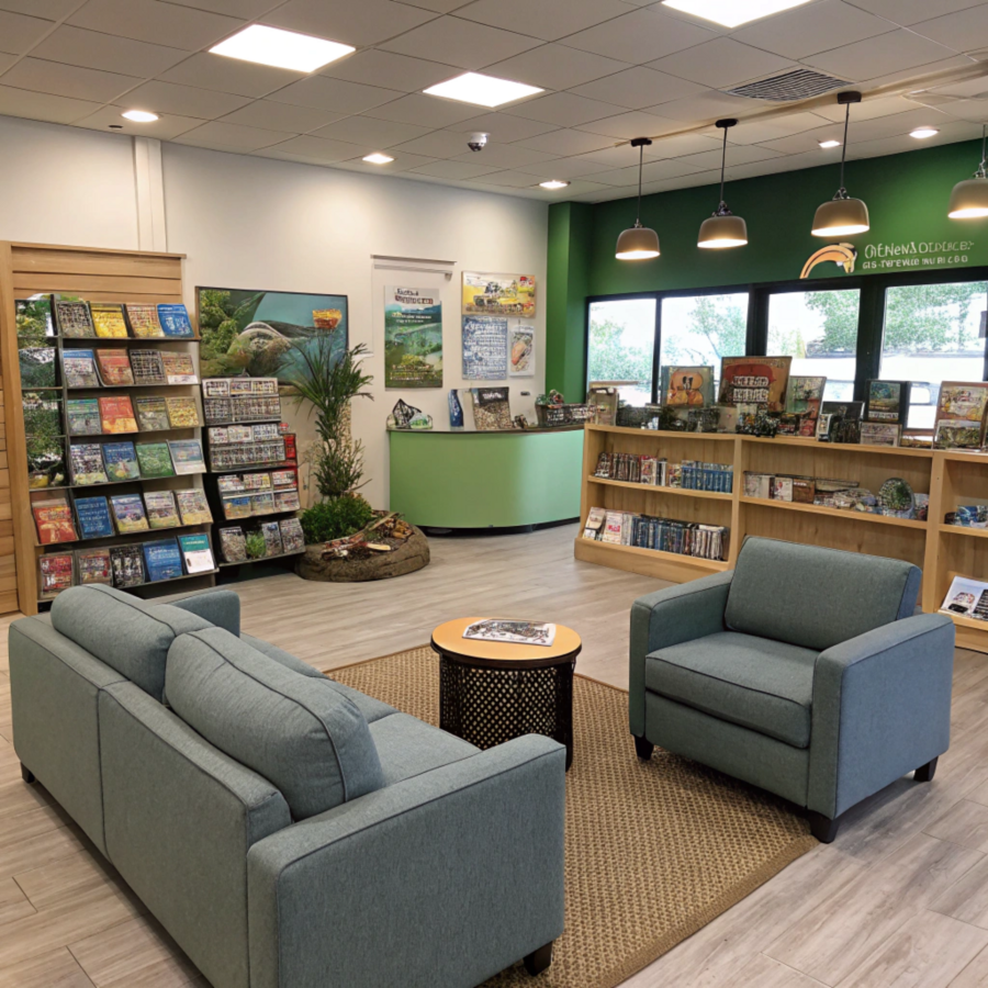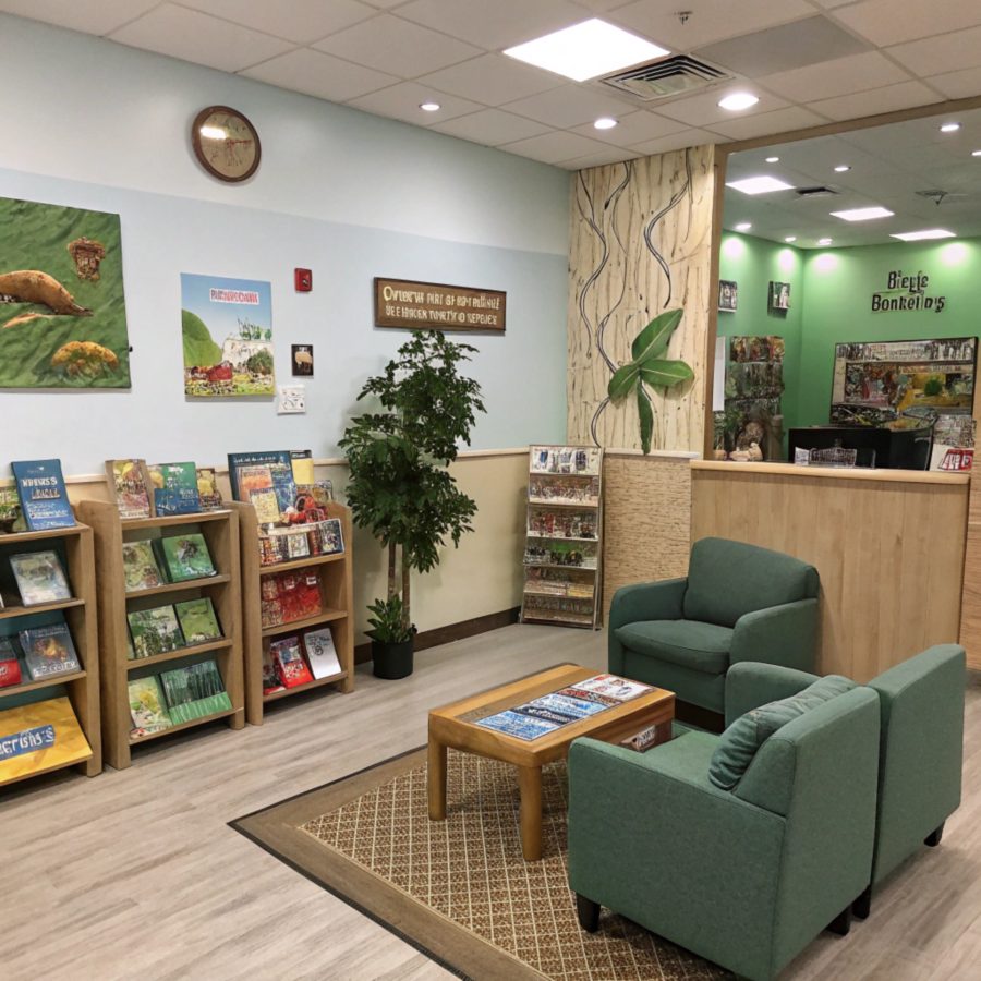 - Comfortable Seating: A small seating area where customers can relax, read brochures, or watch videos about animal care. - Children’s Corner: A corner with child-sized tables and chairs, along with books, puzzles, and games related to reptiles and amphibians.