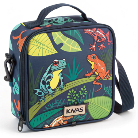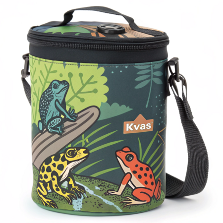 Promit: A thermos bag with an image of amphibians and a KVAS brand tag