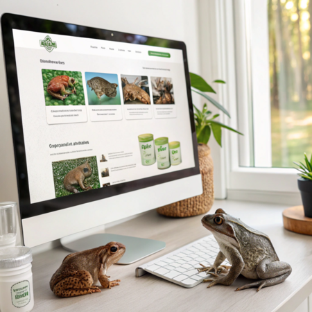 Promit: Photo of the site, photos of amphibian vitamin supplements and photos of amphibians on the site. The website is on the computer. There are frogs next to the computer