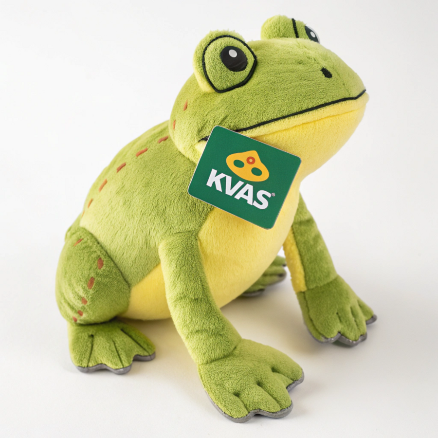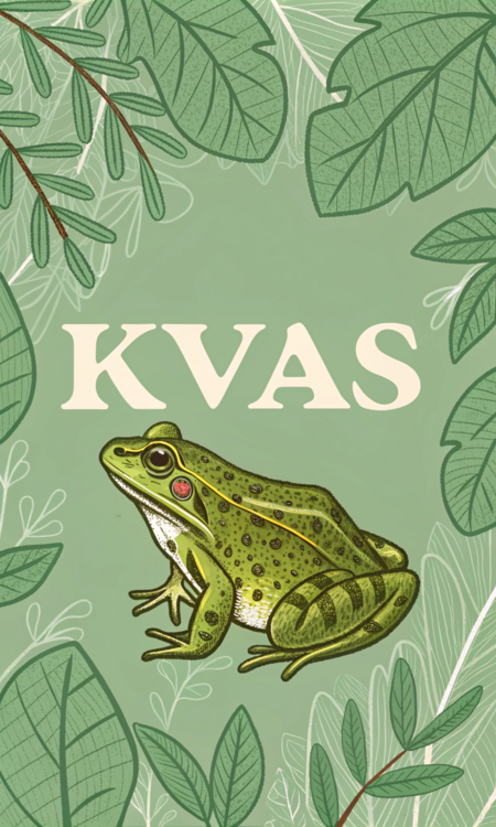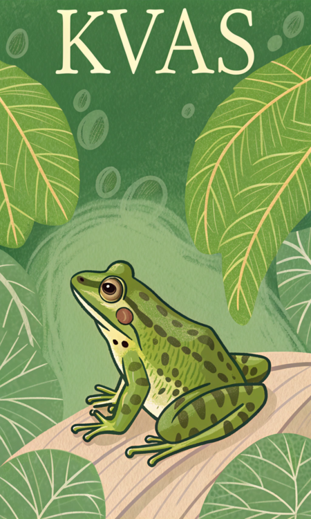 Promit: Illustration of a frog on a green background and on a background of leaves with text KVAS