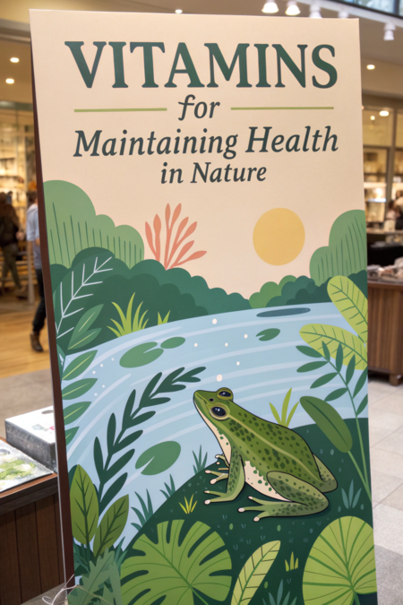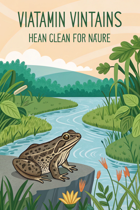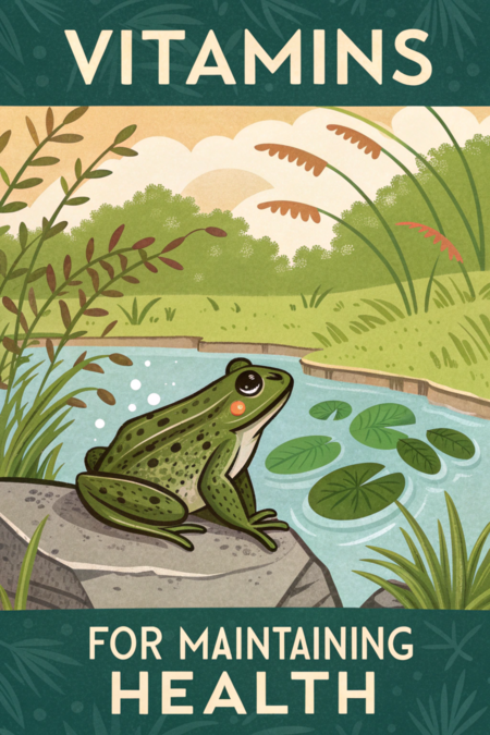 Natural Environment: An illustration of an amphibian in its natural habitat, surrounded by lush greenery and clean water, emphasizing the importance of vitamins for maintaining health in nature.