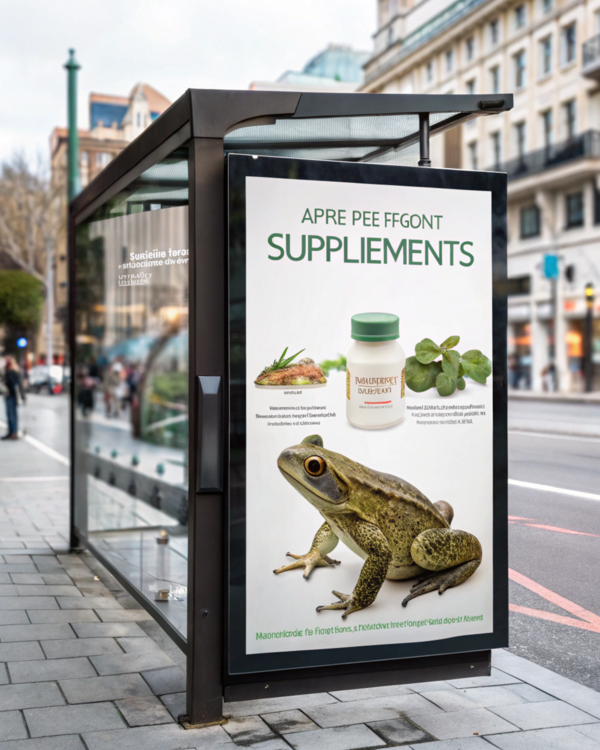 Запрос в чат GPT: Опиши изображение на английском: пластиковая банка с витаминными добавками с изображением амфибий на этикетке. Рядом рассыпан белый порошок и сидит лягушка