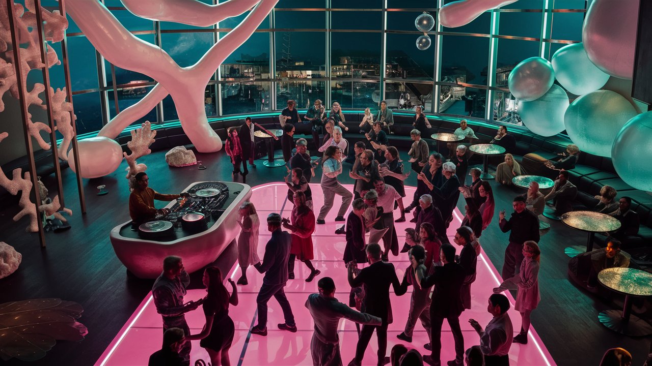 A dancing crowd in a high-end trendy bar, a glowing pink neon floor, interior coral and large organic shaped bubbles that stretch along the walls and ceiling, neon lighting, deep sea diving aesthetic, cinematic | Ideogram