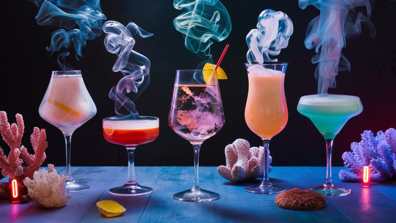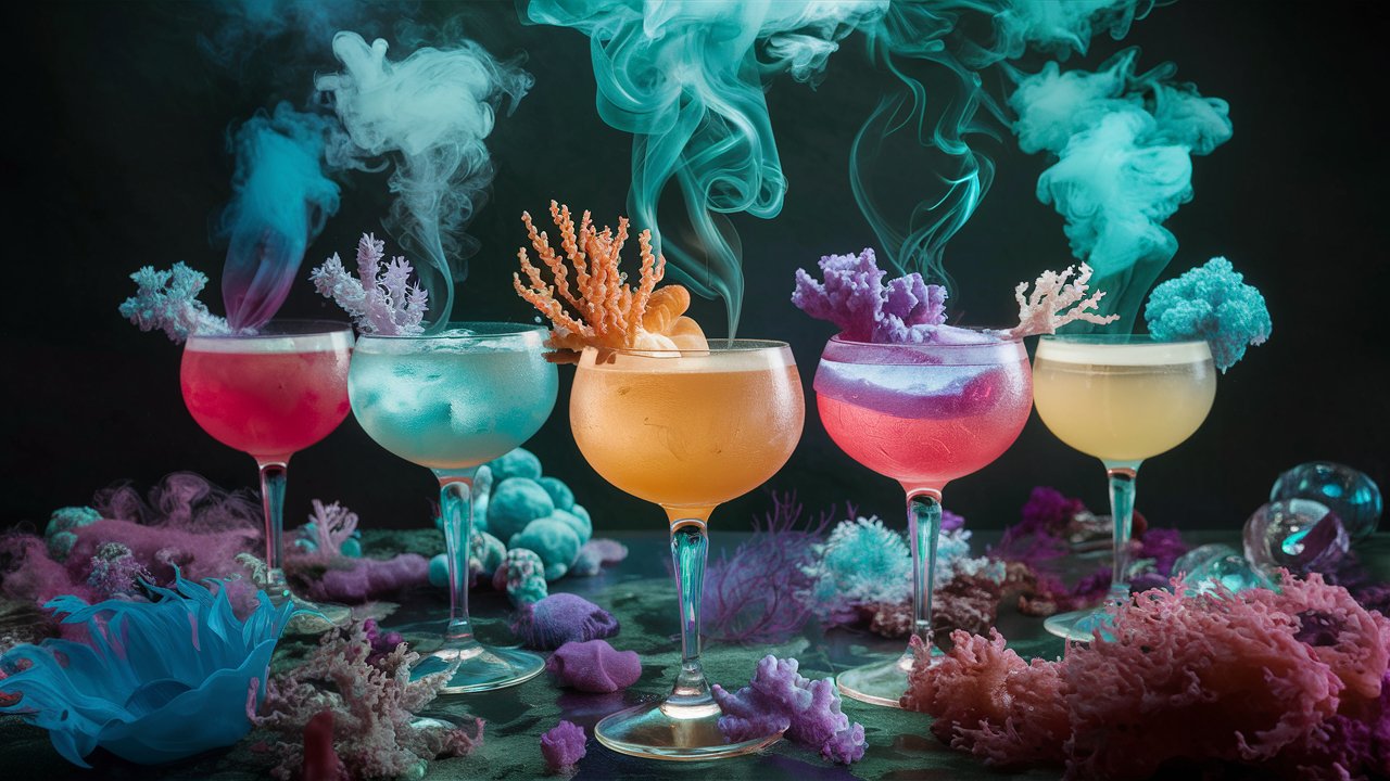 Set of 5 unusual transparent cocktails of different colors with an interesting design among corals and anemones, cocktails like smoke evaporate in the air and mix with the environment, neon lighting, aesthetics of deep sea diving | Ideogram