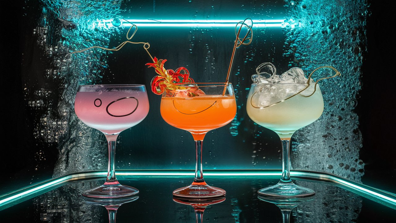 Set of 3 unusual empty transparent glasses of different colors with interesting cocktail design on a background of bubbles, neon lighting, deep sea diving aesthetics, cinematic, photo | Ideogram