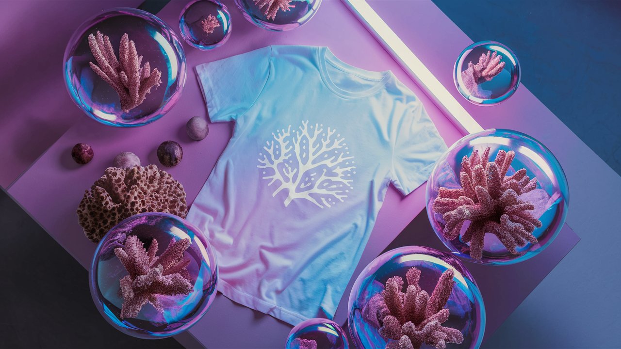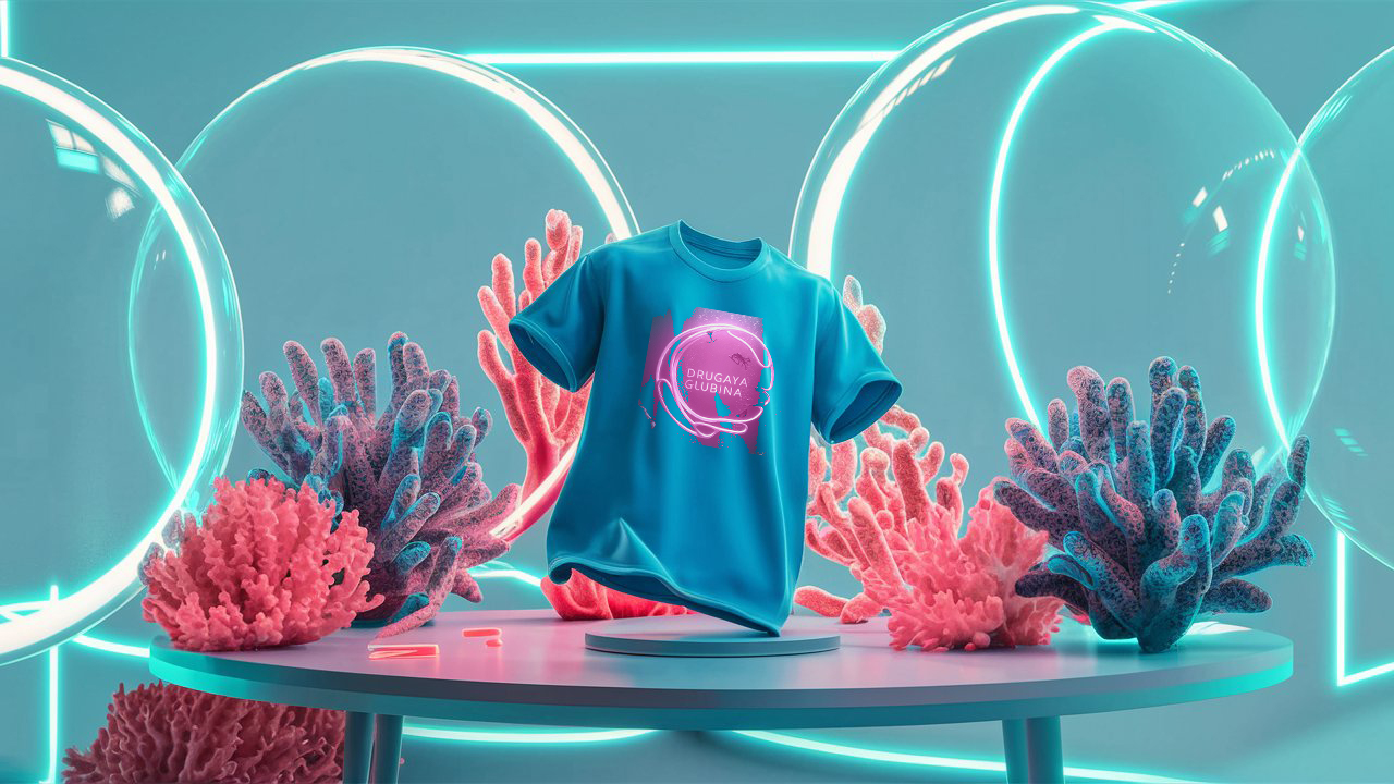 Prompt | Ideogram A minimalistic blue t-shirt mockup among massive bubbles and corals lying on a table, top view, close-up, neon light.