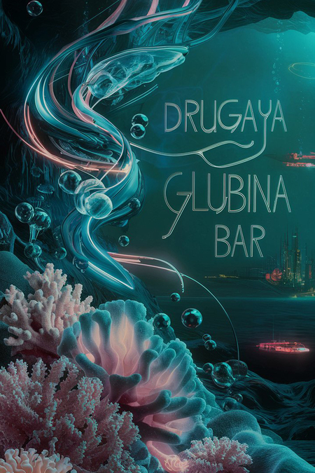 A captivating digital rendering of a deep ocean bottom with pastel corals and glowy anemones, surrounded by swirling neon lights and flowing lettering and massive bubbles. The text «DRUGAYA GLUBINA bar» is prominently displayed in thin, neon lettering, in organic shapes. The background features a abyssal ocean with a few neon-lit submarines and a city under the sea. The overall atmosphere is atmospheric and cinematic, with a blend of otherworldly and futuristic elements., poster, cinematic | Ideogram