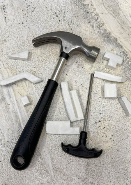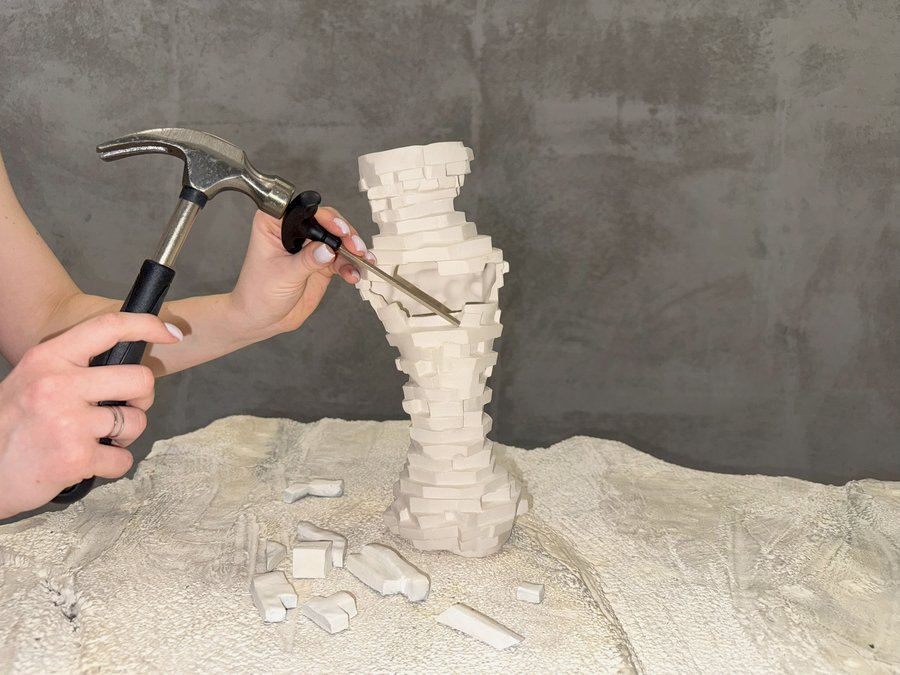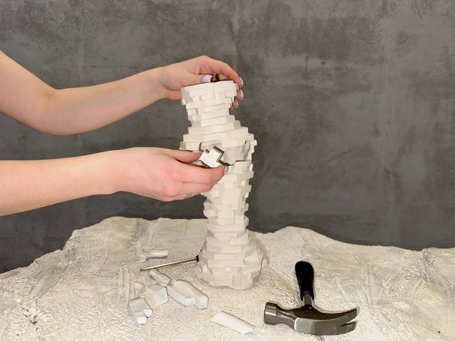 В работе использовала фарфор и глазурь, имитируя камень. Это игра с восприятием, заставляющая задуматься о природе реальности и иллюзии. Я намеренно подчеркивала недостатки высеченного камня предмета—сколы от скарпеля, царапины.