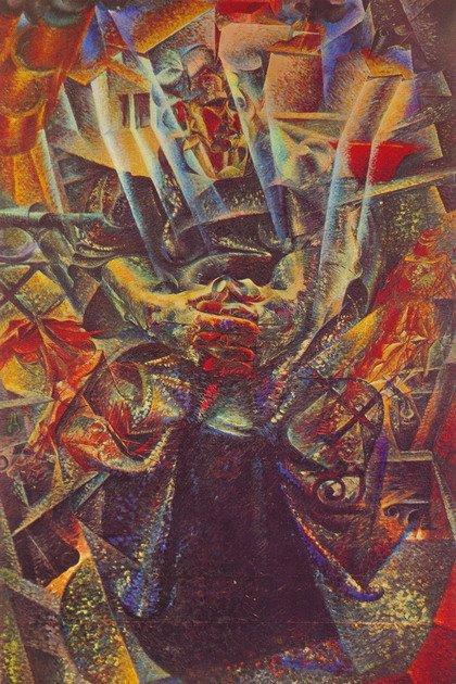 Боччони демонстрирует, что город — это не только здания и улицы, а пейзаж не просто пространство, а силовые линии. Любая картина — это ощущения.