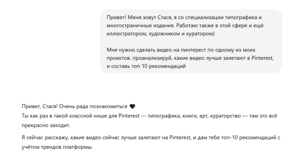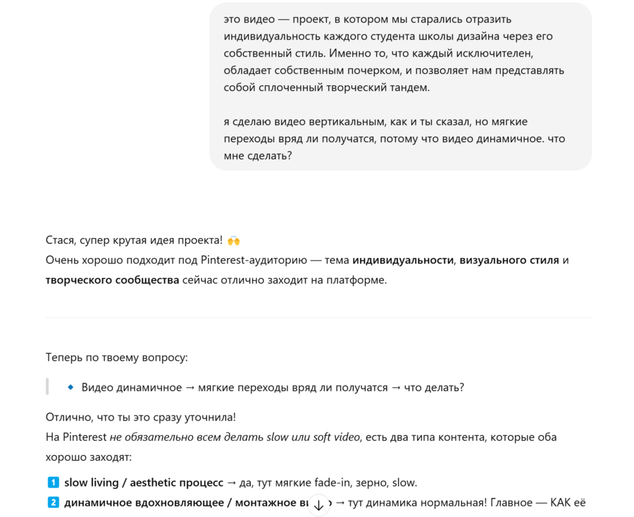 ИИ в этом процессе стал не только помощником, но полноценным соавтором — он помог выстроить структуру, подсветить тренды, адаптировать материалы под разные платформы и тональности. Через генерацию описаний, заголовков, визуальных решений и метрик я смогла не только усилить подачу, но и по-настоящему переосмыслить, как работает коммуникация в цифровой среде.