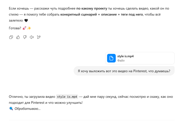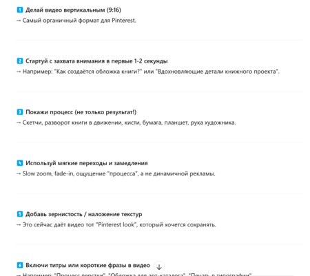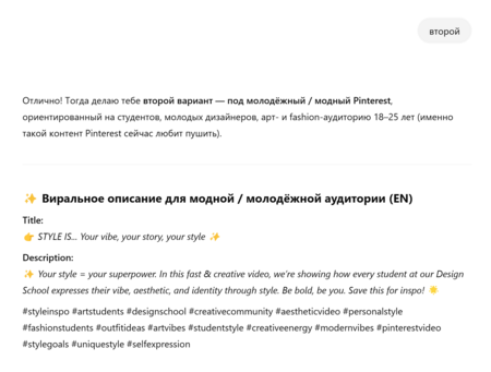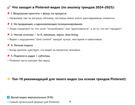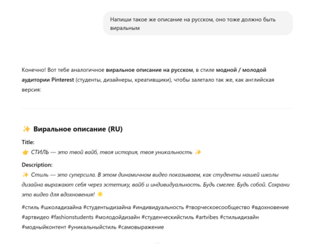— проанализировала, какие видео наиболее виральны на Pinterest, — адаптировала структуру ролика под англоязычную аудиторию, — подобрала ключевые форматы подачи: вертикальное видео, короткий хронометраж, текстовые акценты, call-to-action в конце, — подготовила SEO-описание на английском языке и релевантные теги, — адаптировала описание на русском для дальнейшего перекрестного продвижения.