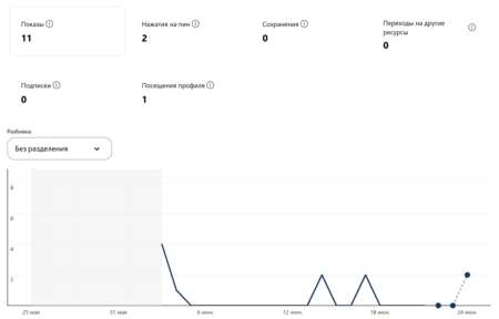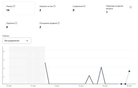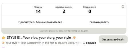 Русскоязычное видео показало наименьшие охваты и чуть меньшую вовлечённость, чем статья. Контент не провалился, но резонанс оказался слабее — возможно, из-за формата или низкой активности русскоязычного Pinterest-сегмента.