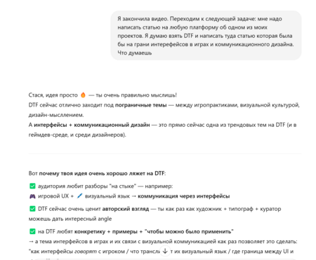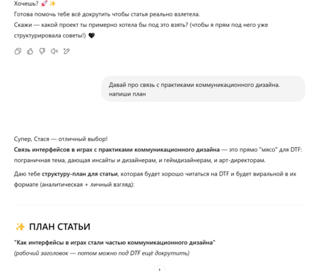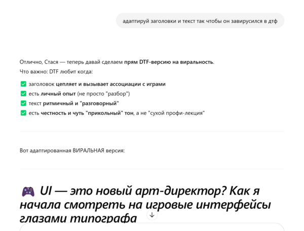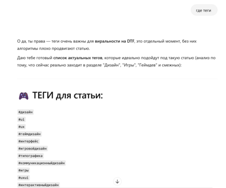 — сформулировала структуру статьи и логические переходы между разделами, — подобрала Tone of Voice, который работает на DTF: честный, неформальный, с элементами самоиронии, — получила аналитику по успешным статьям на платформе, — встроила личный опыт через пример проекта «Сёрф-календарь», — адаптировала заголовки, подзаголовки и финальные вопросы так, чтобы запускались обсуждения в комментариях, — составила набор релевантных тегов.