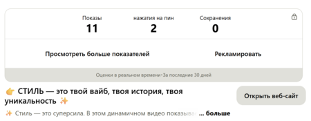 Русскоязычное видео тоже показало хорошую вовлечённость, но чуть ниже. Возможно, стоит адаптировать формат и описание под поведение локальной Pinterest-аудитории — сделать менее абстрактно и чуть ближе к lifestyle/edutainment.