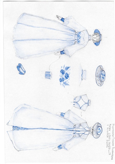 Модель « Елизавета». Описание концепции, идеи: Платье для тематической встречи, для фотосессии. Цветовая гамма в данном эскизе: белый, синий. Верхний слой юбки, рукавов и верхней части платья из лёгкой, воздушной белой ткани типа: органзы, маркизета, вуали. Нижний слой юбки и манжеты рукавов из более плотной ткани синего цвета (например, натуральный лен). Спереди от пояса вниз идут две вертикальные складки. На спине вырез в форме ромба. Сзади ворот завязывается в бант. Снизу на синей ткани юбки выполнен белый узор в виде бутонов цветов и листьев. Рукава «епископ» с расширением к низу. Внутренняя сторона шляпки выполнена в синем цвете. Описание элементов НПХ, использованных в эскизе: На верхней части манжеты рукавов расположена вставка из кружева. По краю горловины выполнен узор из листьев в технике «гжель». Поля шляпки обработаны кружевом, на ее тулье выполнен рисунок в виде бутонов цветов и листьев в технике «гжель».