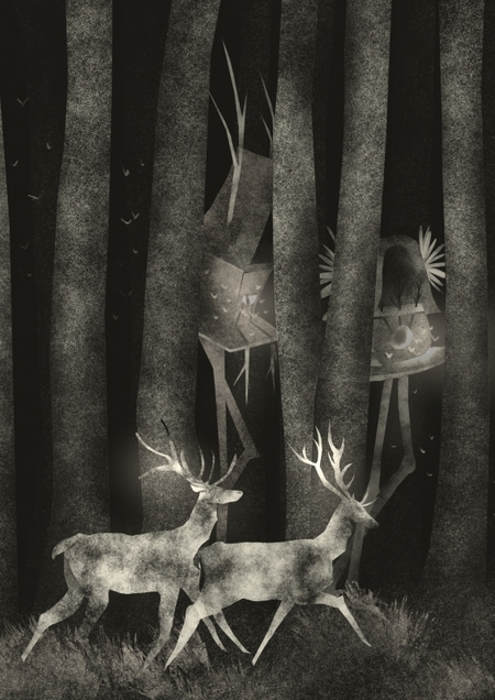 В иллюстрациях я хотела передать таинственную атмосферу леса, включить в сюжеты героев рассказанных сказок и сделать акцент на мотыльках, слетающихся на свет