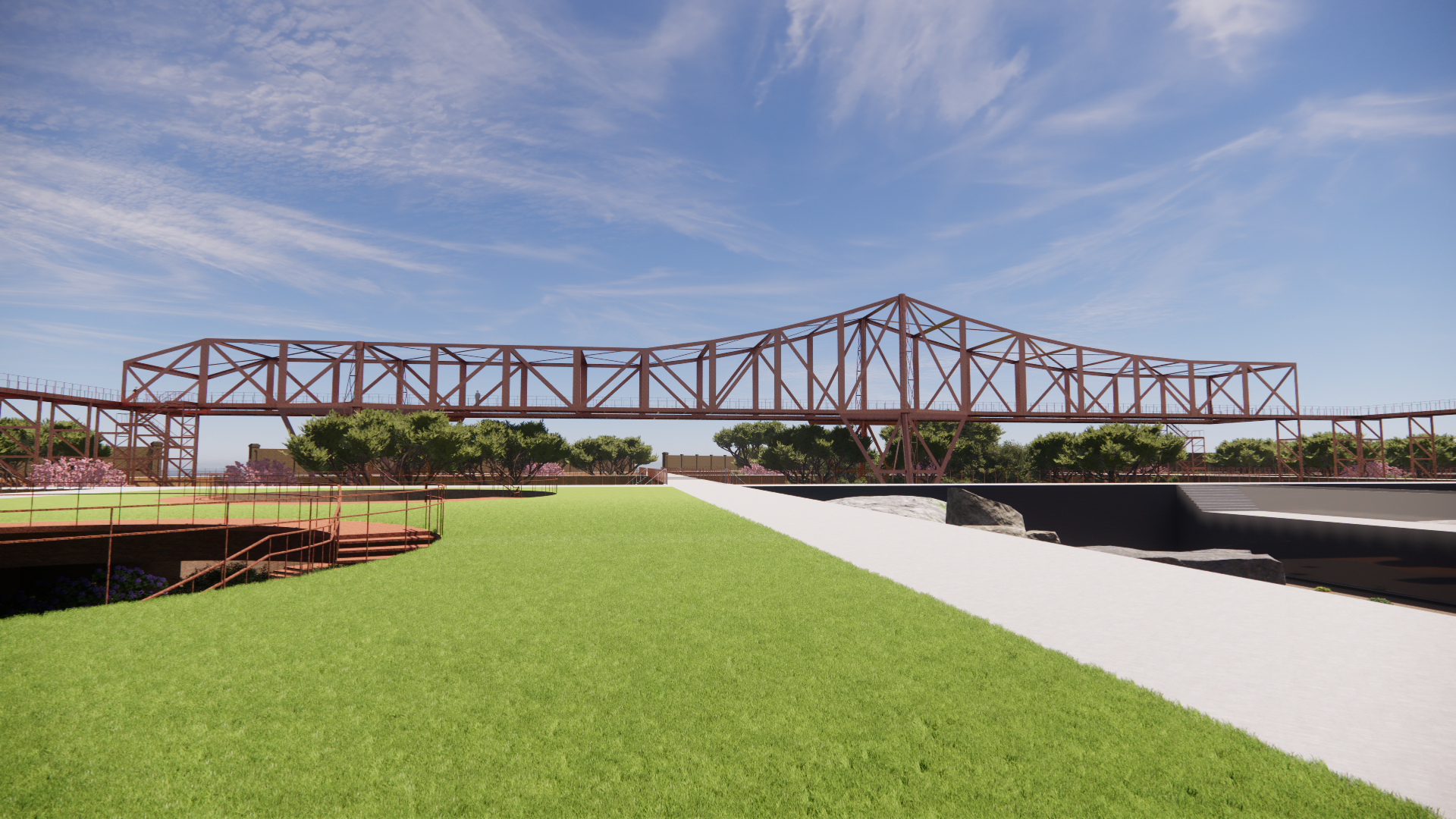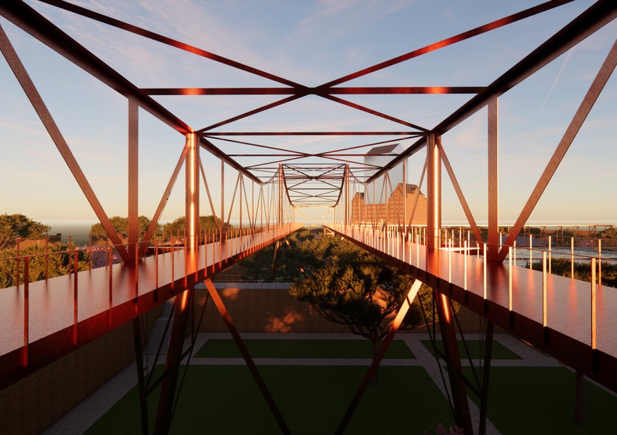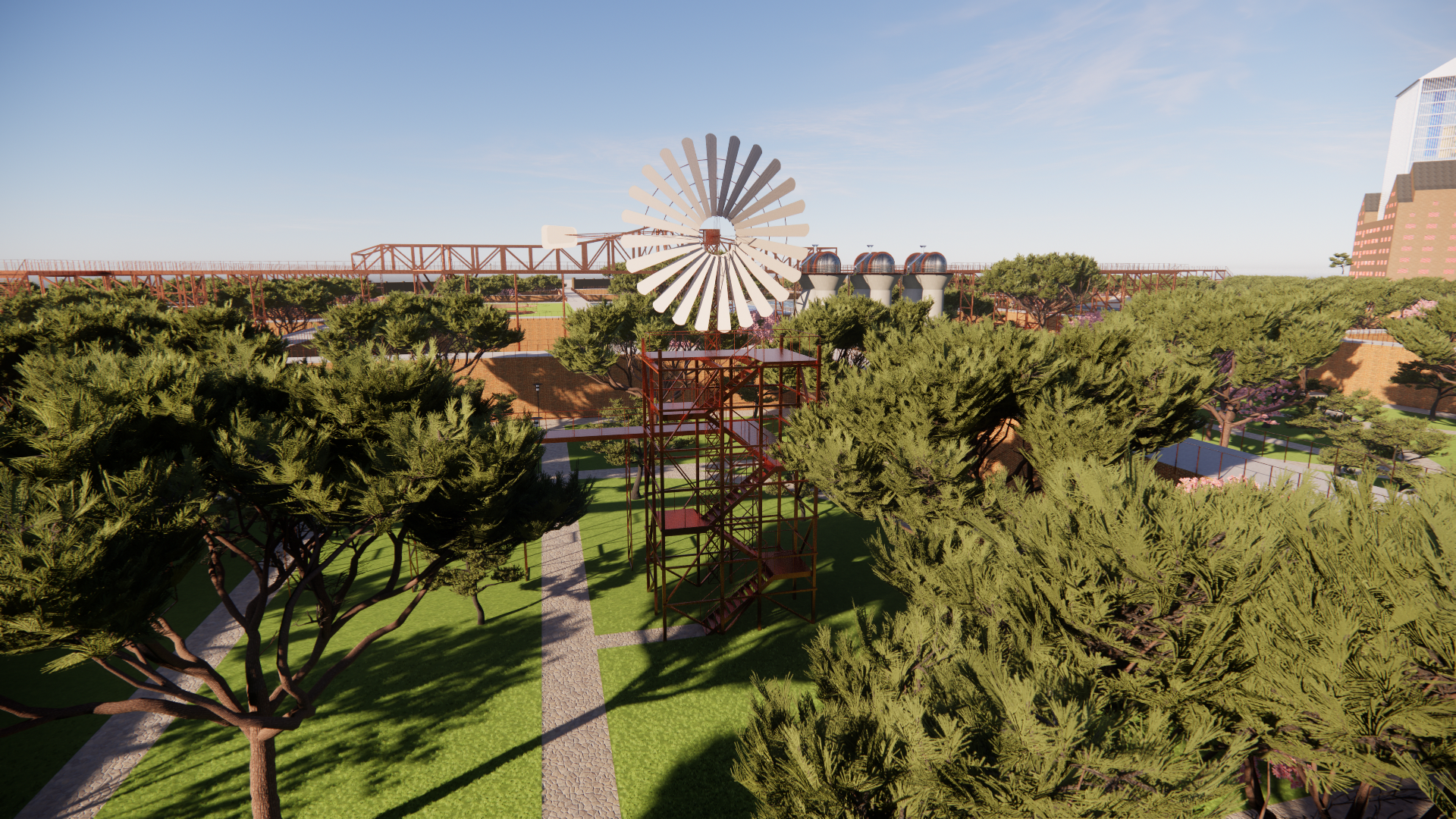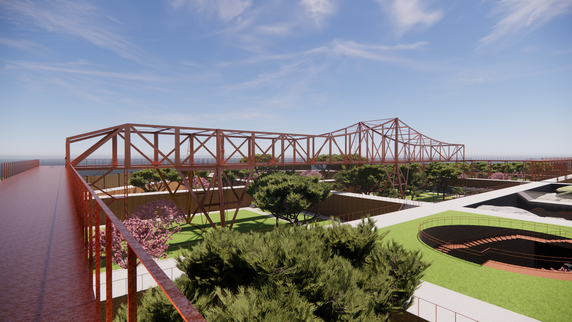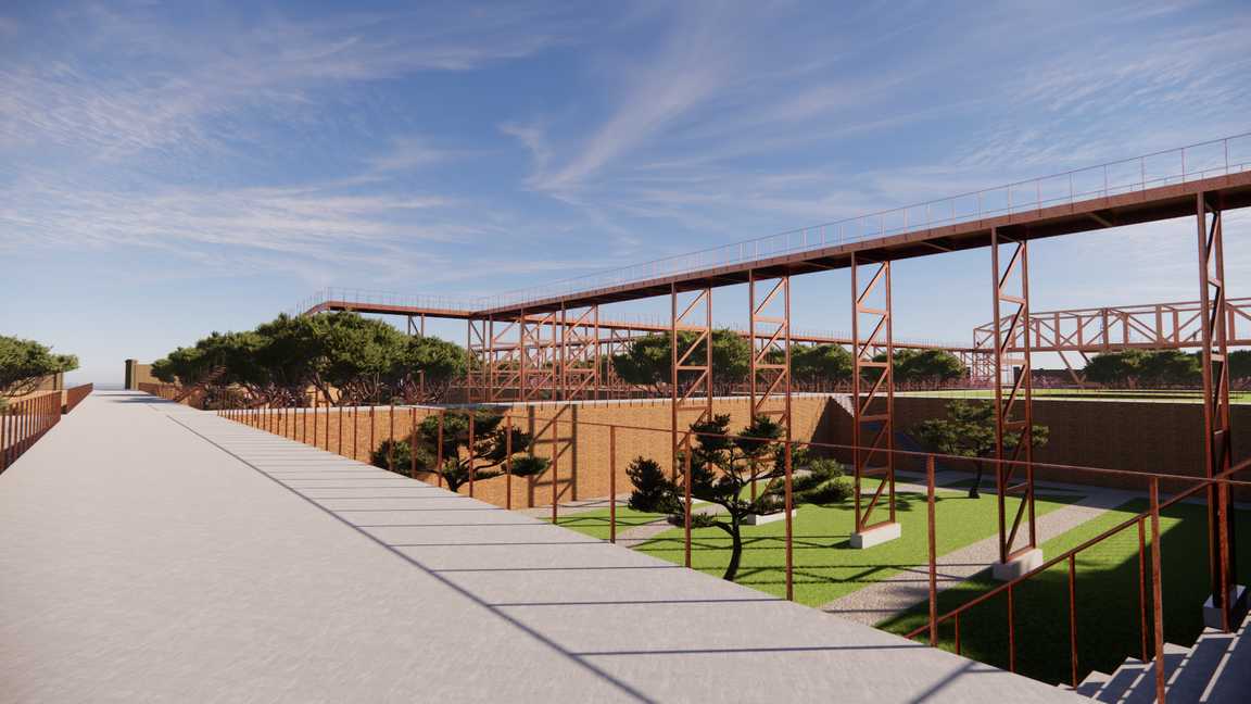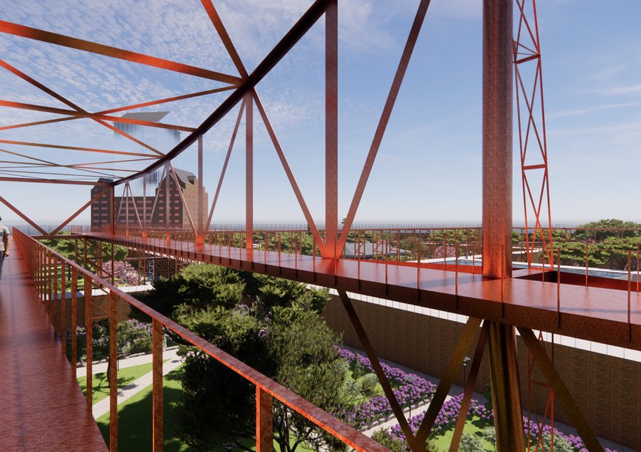 Смотровая площадка выполнена в виде металлического моста, который соединен с системой верхних дорожек. С нее открываются живописные виды на весь парк, также с двух сторон имеются лестницы, на случай если посетителям захочется спуститься в зеленую зону парка.