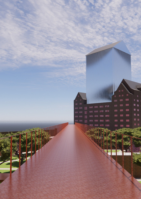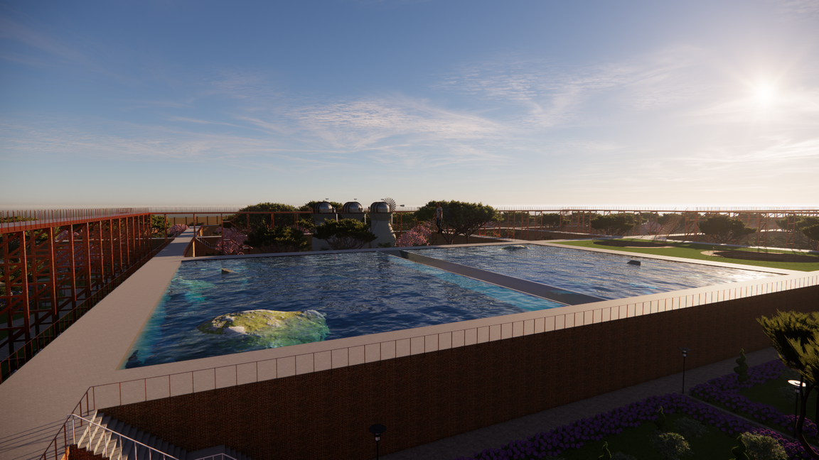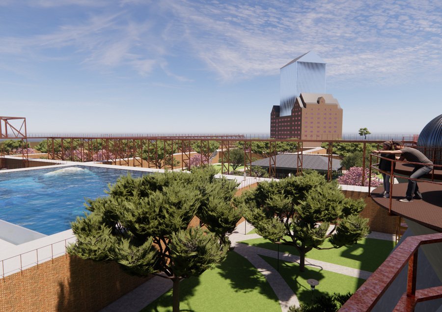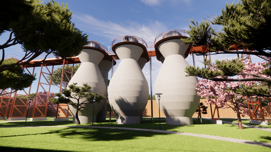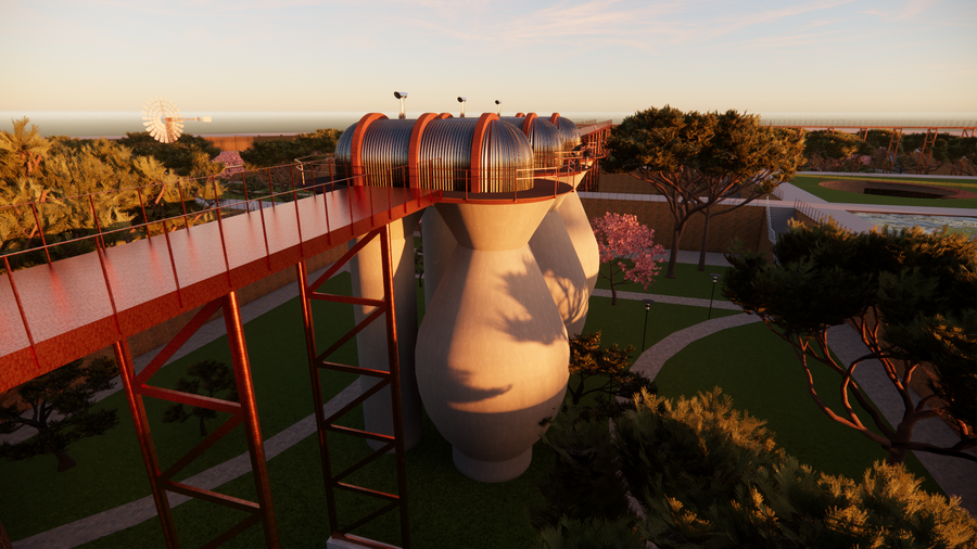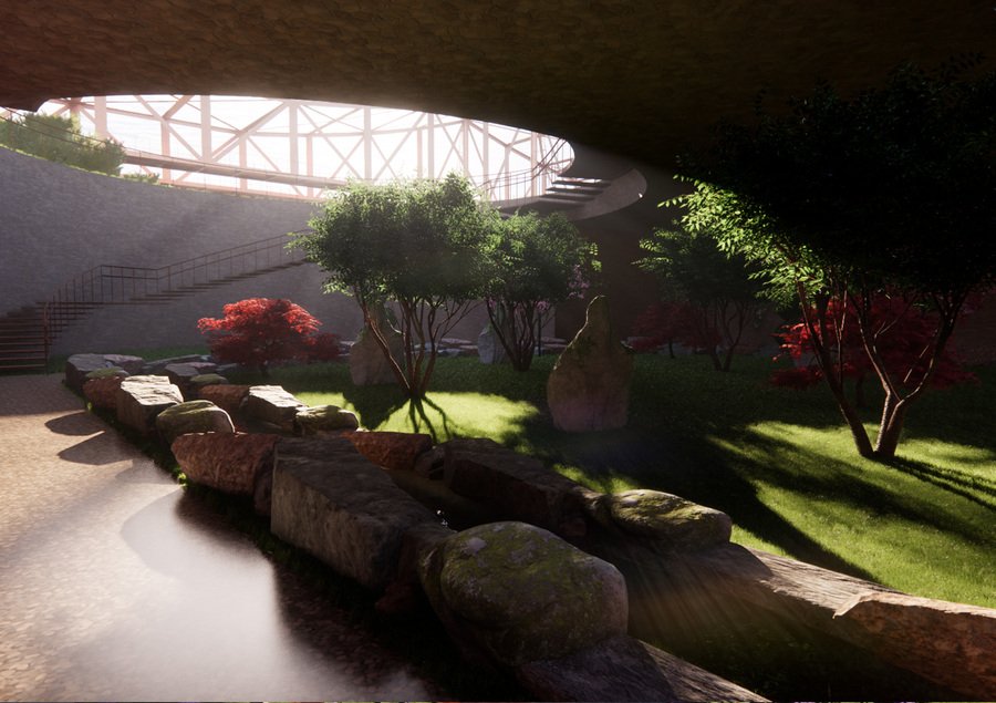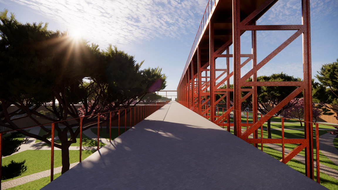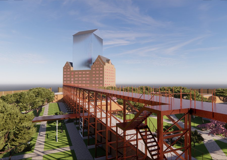 Смотровая площадка выполнена в виде металлического моста, который соединен с системой верхних дорожек. С нее открываются живописные виды на весь парк, также с двух сторон имеются лестницы, на случай если посетителям захочется спуститься в зеленую зону парка.