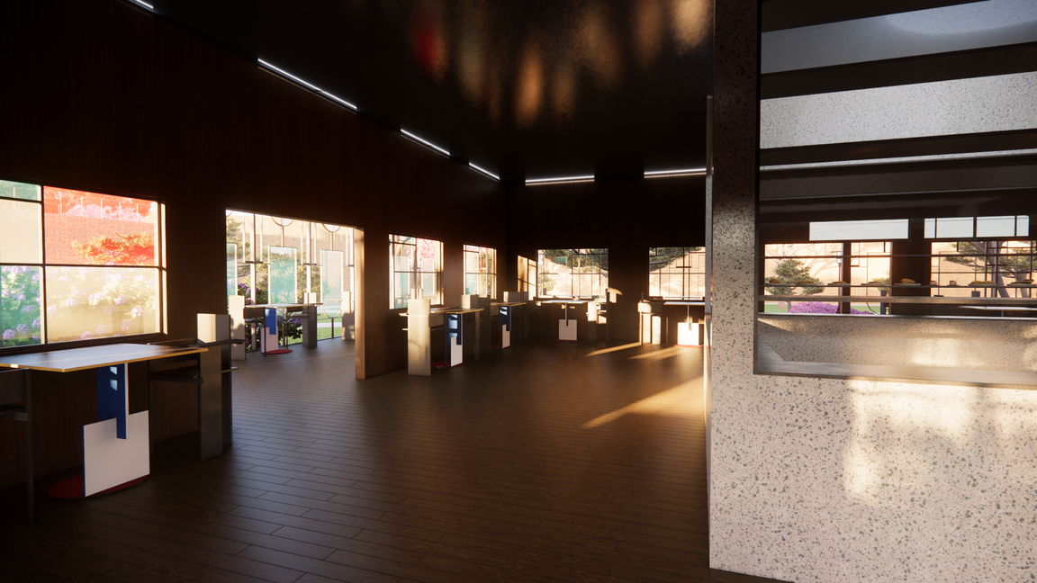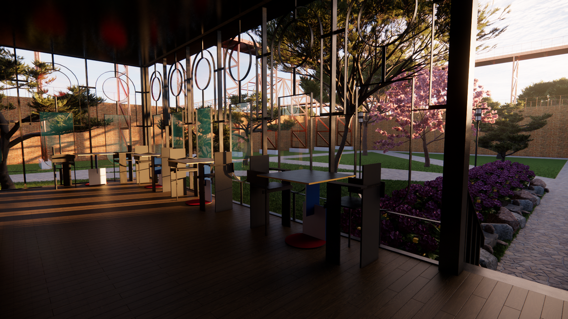 Кафе расположено в одной из зеленых зон парка. Его окружает собственный сад, который скрываент кафе за своей листвой и создает особую атмосферу спокойствия. В здании ест открытая и закрытая веранда. Летняя веранда окружена витражами, выполненными в фирменных цветах Тео ван Дусбурга. Однако витражные окна оборудованы и в закрытом зале, наполняя его красивым светом. Столы и стулья выполнены в стиле неопластицизма. Внутри кафе посетители могут заказать кофе и разлитчные десерты к нему.