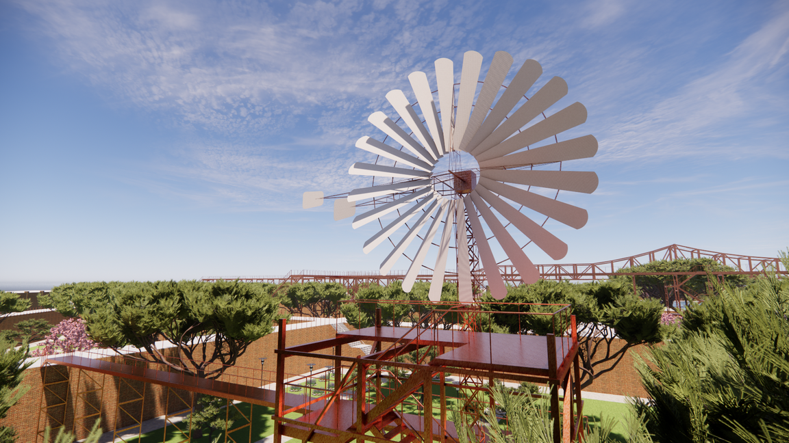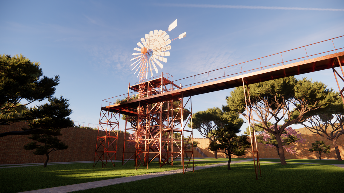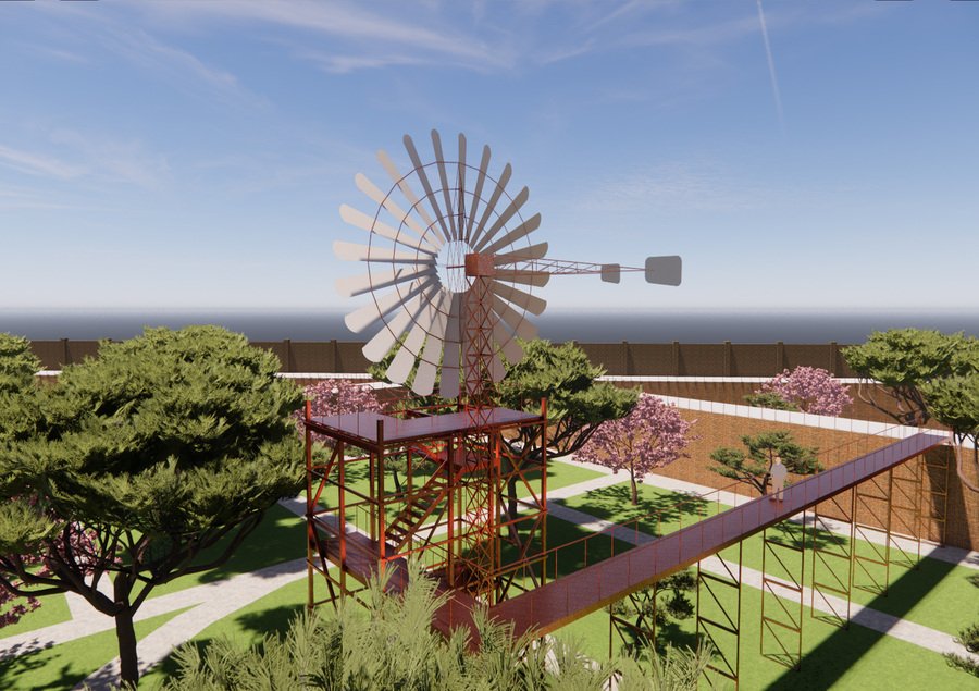 Данная смотровая площадка соединяется со вторым уровнем дорожек и является самой низкорасположенной по сравнению с другими. Она представляет из себя реконструкцию мельницы. Также смотровая площадка имеет спуск в зеленую зону парка, который является цельной частью конструкции.