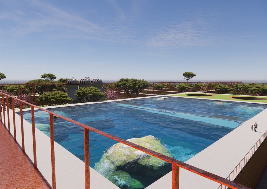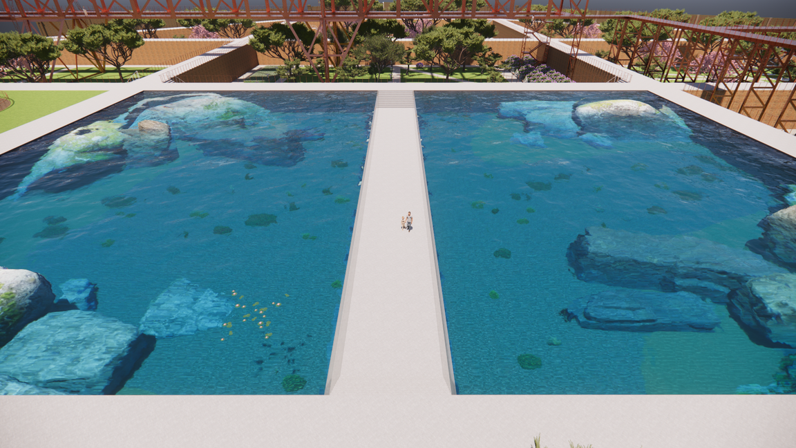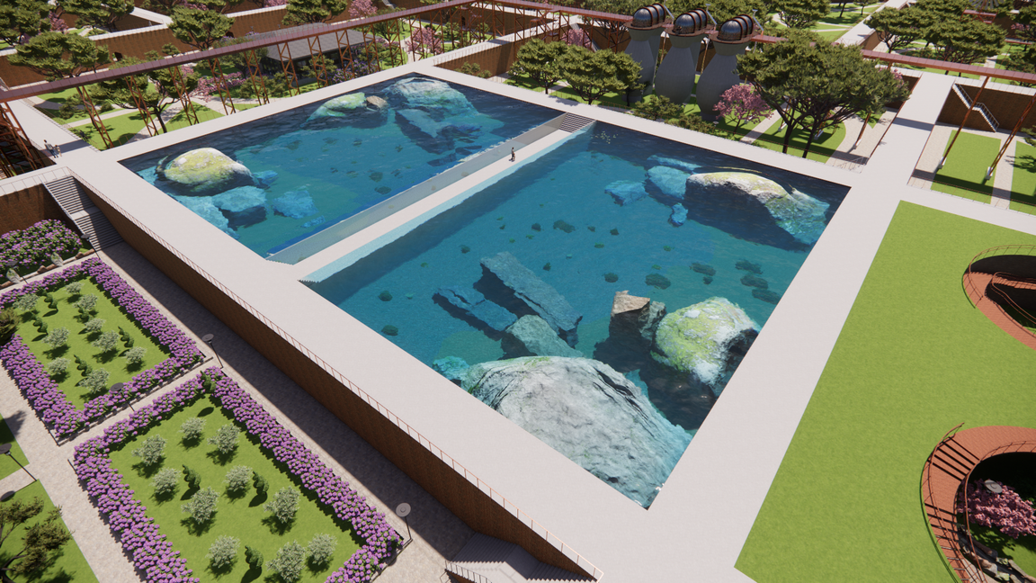 Еще одним интересным местом парка стала водная зона, расположенная в центре. Ее отличительной особенностью является туннель, который спускается под воду и позволяющий рассмотреть дно, а также его подводных жителей.