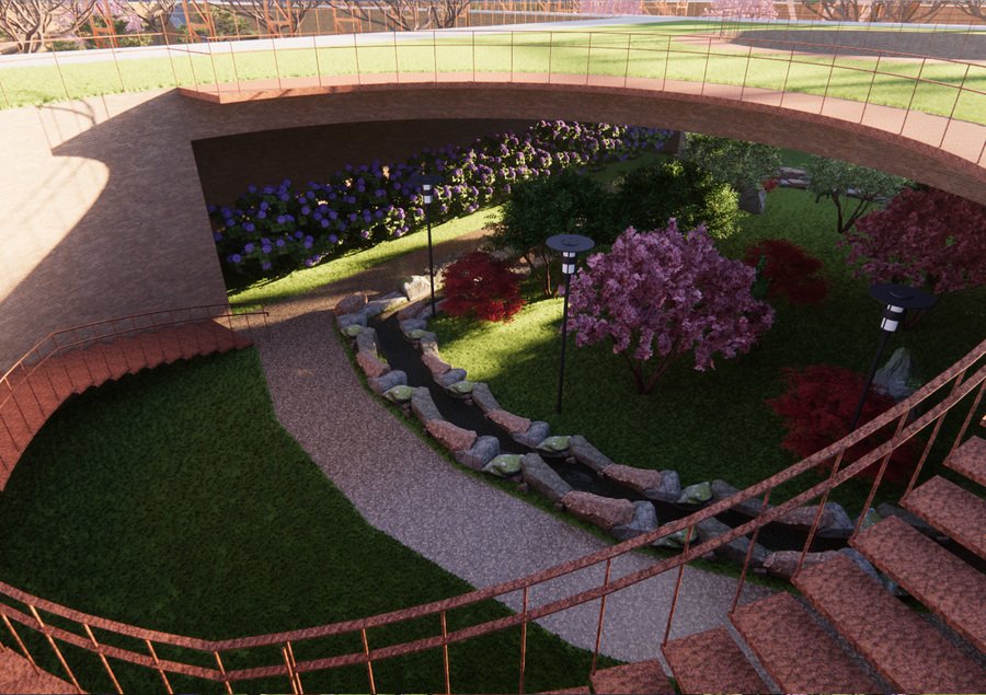 Одно из самых эффектных мест парка. Маленький японский садик располагается в двух нишах в земле. В саду есть свой ручеек, а также уникальные растения, которых нет в других частях парка. Наиболее живописно сморятся солнечные лучи, которые пробиваются сквозь ниши и наполняет маленький садик светом.