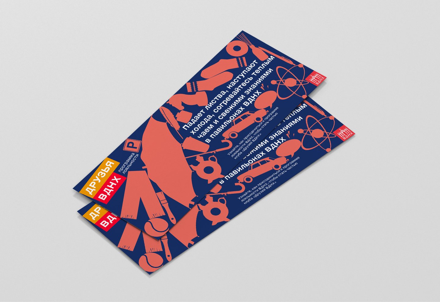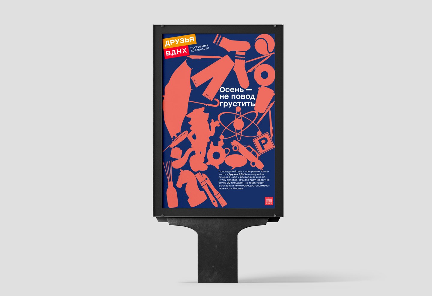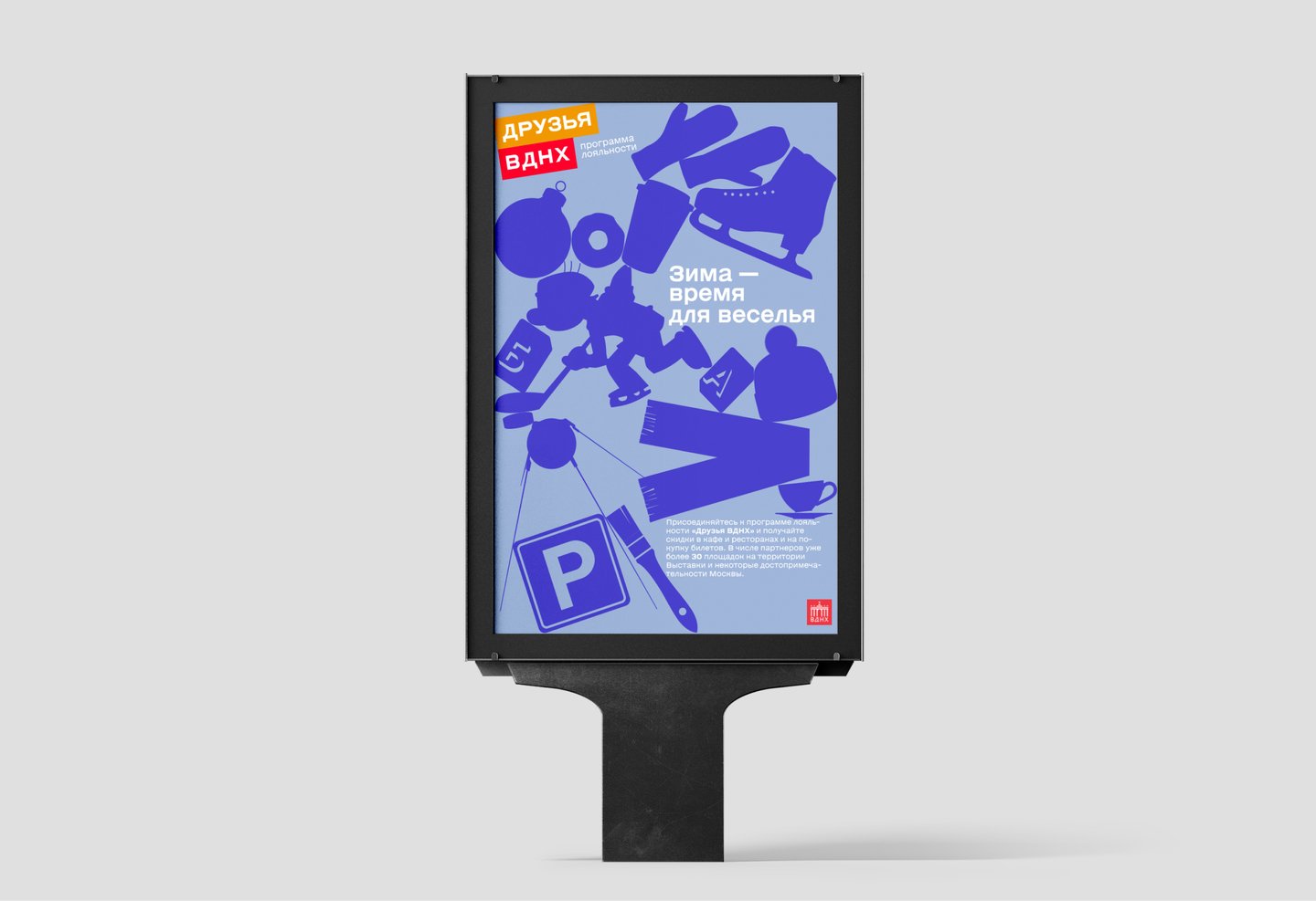 В проекте представлен концепт обновленного визуального стиля программы «Друзья ВДНХ». Фирменный стиль включает в себя, помимо основных констант ID, разработку KV/сценарий видеоролика