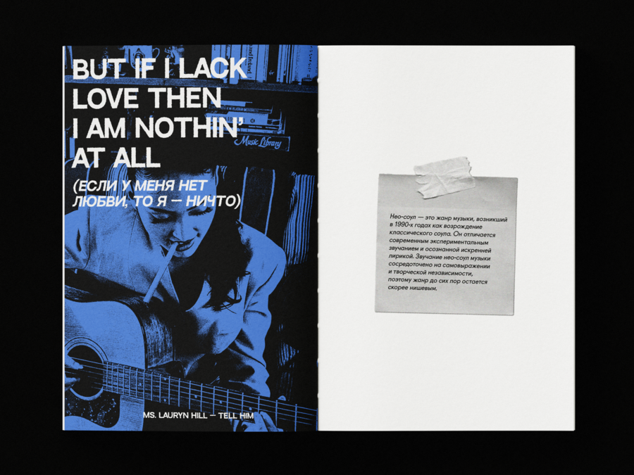«soul mate» — это авторское исследование современной британской нео-соул сцены, воплощённое в формате уникального зина. Этот проект — не просто сборник материалов, а художественное высказывание, попытка передать дух и эстетику жанра через текст, визуальные образы и дизайн. «soul mate» переносит звук на бумагу, создавая пространство для размышлений, открытий и вдохновения, а также раскрывая глубину и многогранность актуальной музыки.