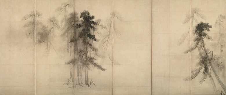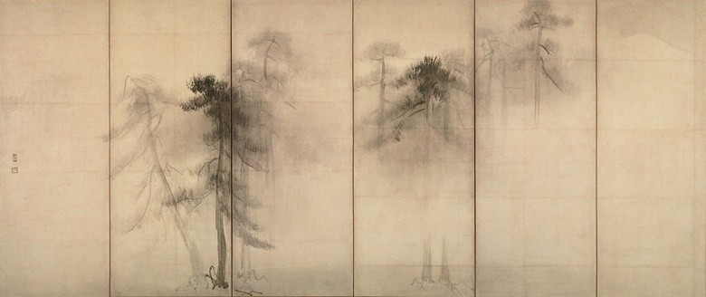 Одним из самых ярких примеров этой таинственности и недосказанности являются работы японского художника, Хасэгава Тохаку. С помощью приема ёхаку — эффекта пустого белого пространства на полотне — он стремился не просто передать символизм японских пейзажей, но и воззвать зрителя к чувству одухотворенности, передать духовность физического мира. И всего этого он достигает, используя только лишь один цвет.