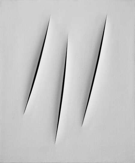 Монохромные холсты с прорезами Лучо Фонтаны из цикла «Разрезы» — это философское воплощение веры в бесконечность. Разрез на монохромном фоне — это символ освобождения от всего материального, выхода за приделы традиционного восприятия мира, пути к духовному и созерцательному.