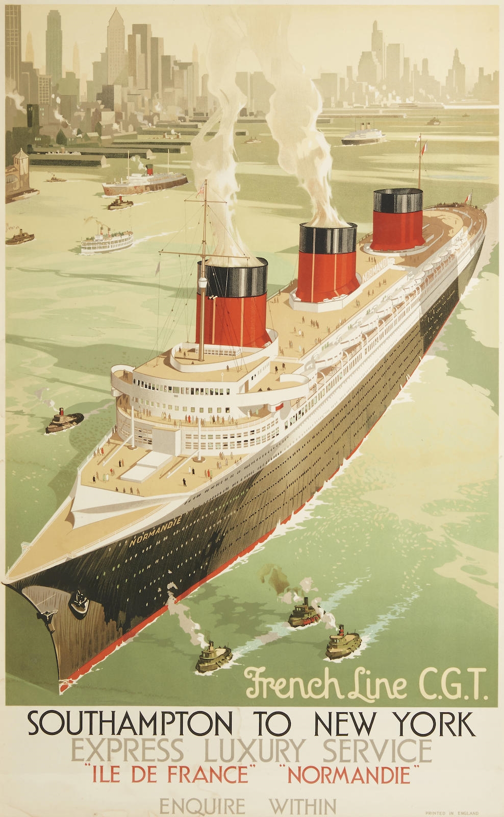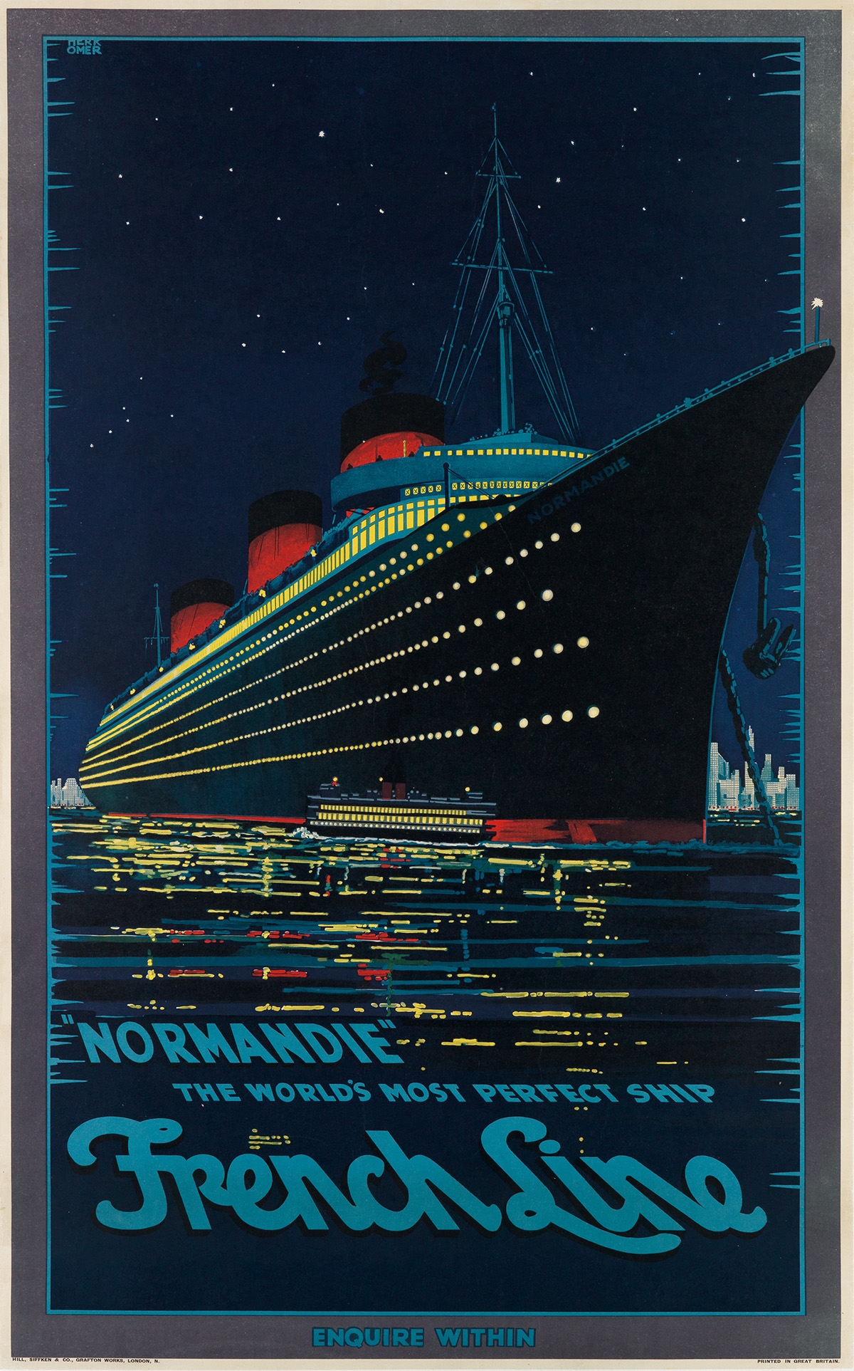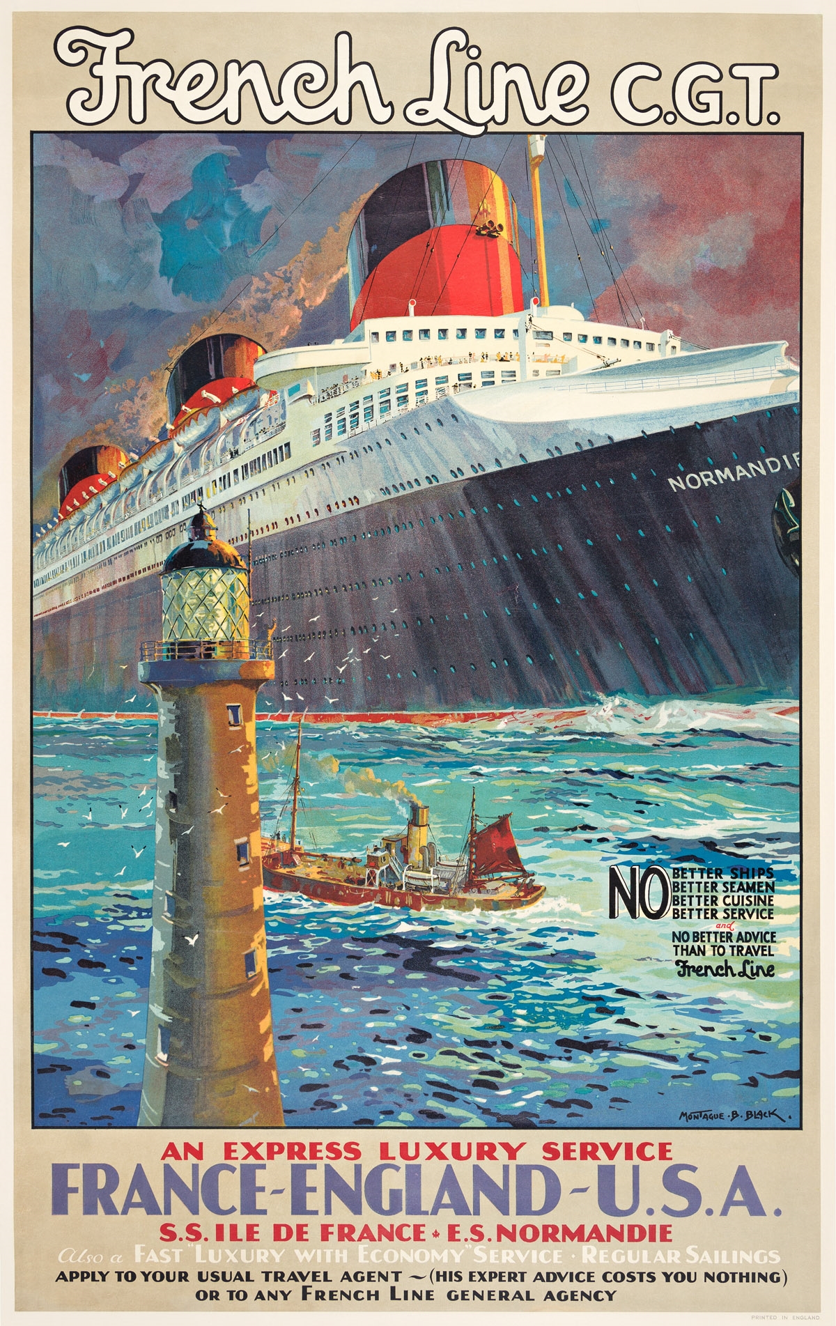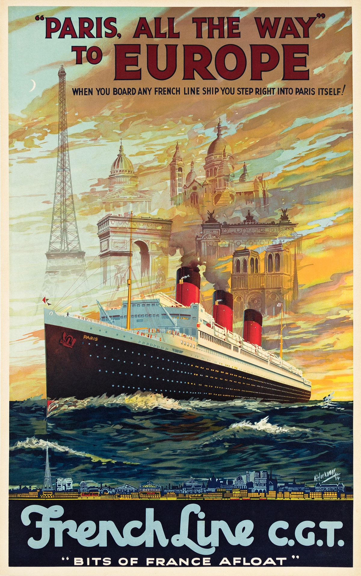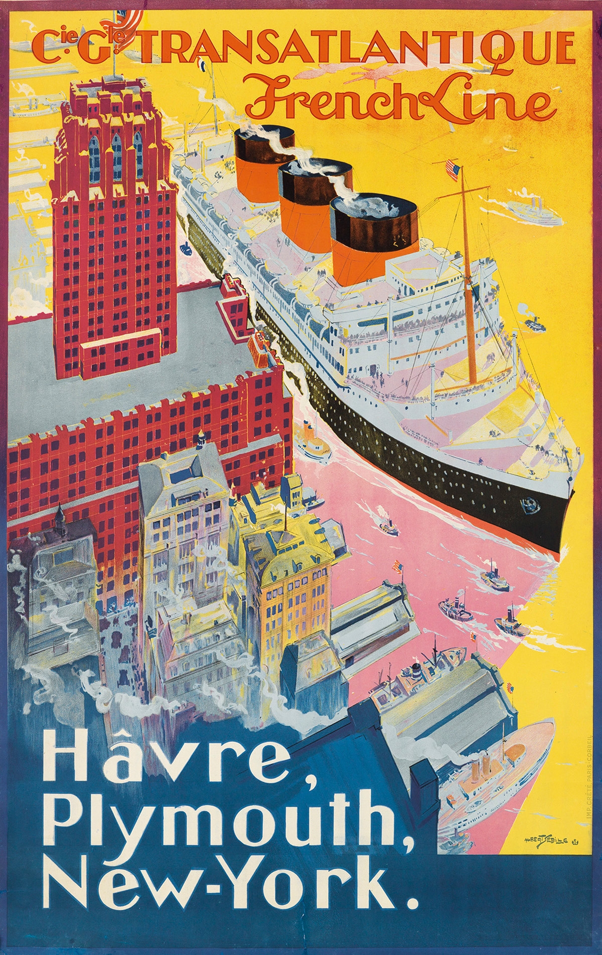 «Компани Женераль Трансатлантик», больше известная под торговой маркой «Френч Лайн» — французская судоходная компания, основанная в 1855 году братьями Исааком и Эмилем Перэр. В состав также входила «Компани де Навигасьён Суд-Атлантик» — дочерняя компания с маршрутами, ограниченными территорией Южной Атлантики, в основном в страны Южной Америки. Авторы плакатов: Адольф-Жан-Мари Мурон (А. М. Кассандр) (1901–1968), Монтегю Биррелл Блэк (1889–1964), Жан Овинь (1859–1952), Альбер Себи (1874–1953), Андре Вилькен (1899–2000), Вальтер Томас (1894–1971), Губерт Геркомер, Питер К. Фасси.