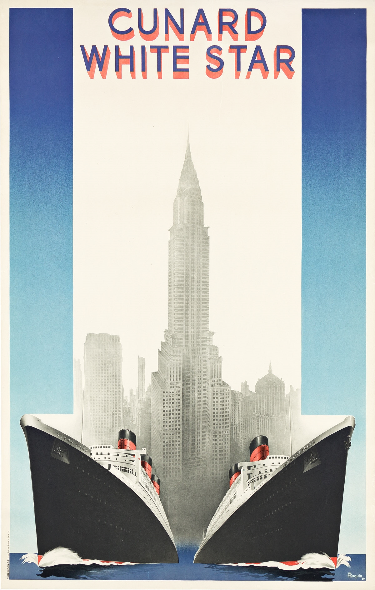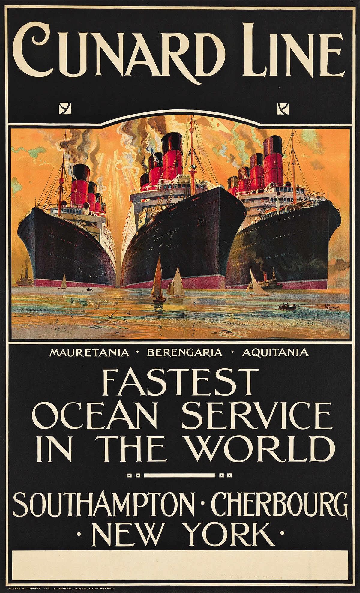 «Кунард Лайн» — британская судоходная компания, основанная в 1840 году сэром Сэмюэлем Кунардом (1787–1865). Авторы плакатов: Один Розенвинге (1880–1957), Кеннет Дентон Шусмит (1890–1939), Алексей Вячеславович Бродович (1898–1971), Уильям Ховард Джарвис (1903–1964), Робер Рокен.