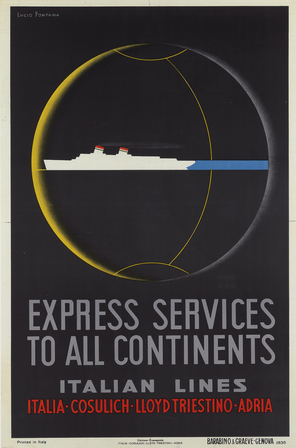 «Италиан Лайн» — итальянская судоходная компания, образованная по распоряжению правительства Италии в 1932 году путём слияния «Навигацьоне Дженерале Итальяна» из Генуи, «Ллойд Сабаудо» из Турина и «Козулич Сочета Триестина ди Навигацьоне» из Триеста. В том же году компании были переданы два новейших трансатлантических суперлайнера, спущенных на воду годом ранее — скоростной «Рекс» и комфортабельный «Конте ди Савойя». Авторы плакатов: Джованни Патроне (1904–1963), Лучио Фонтана (1899–1968), Пауло Федерико Гарретто (1903–1989).