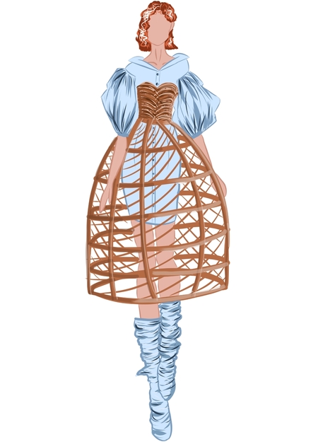 Эскиз современного платья с эффектным дополнением в виде корсетной основы из натуральной лозы. Платье-рубашка с рукавами-фонариками длиной ¾. Может быть изготовлено из ткани, полученной путем переработки вторичного сырья, например нейлона. Эта ткань позволит значительно сэкономить ресурсы нашей планеты. Изюминка модели — корсет из лозы, переходящий в объемную юбку. Лоза издревле использовалась в народно-художественном промысле. В моей родной Рязанской области очень известно Шиловское лозоплетение — неотъемлемый элемент традиционной культуры крестьян. Это народное искусство дало мне идею для создания эскиза. Модель дополнена необычными высокими сапогами в тон платью-рубашке. В этой модели искусно контрастирует лёгкий силуэт платья с рукавами-фонариками с жёстким прочным корсетом.
