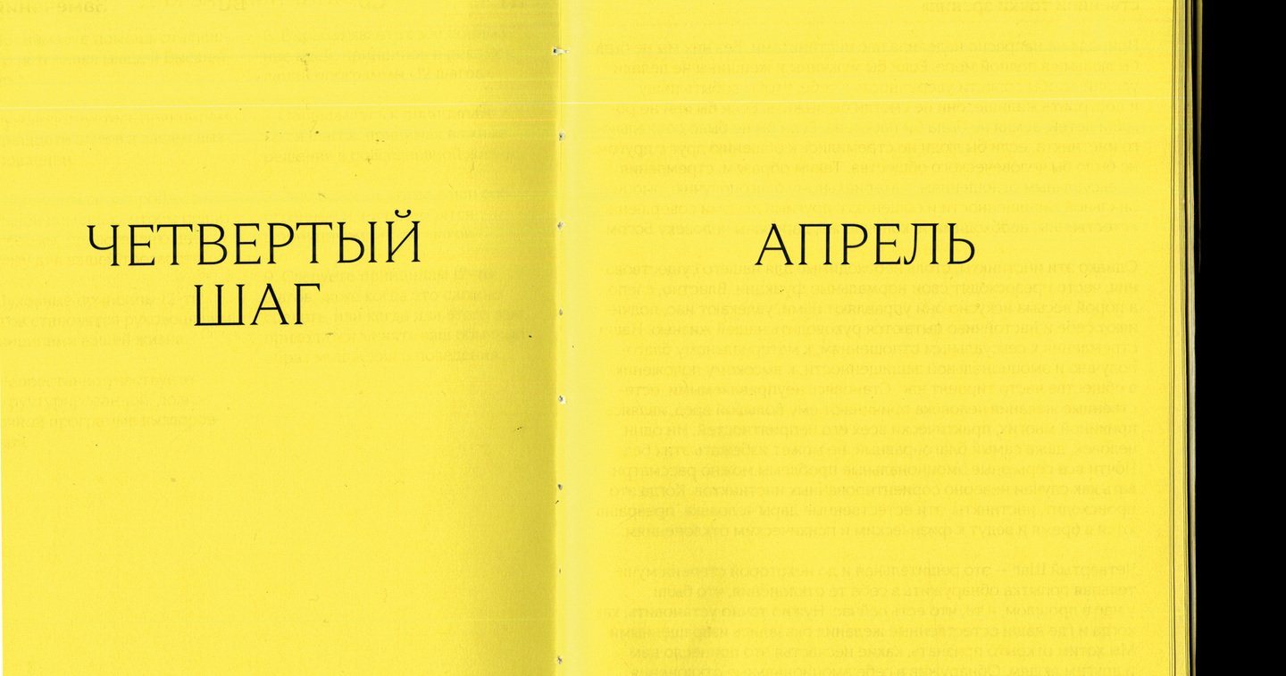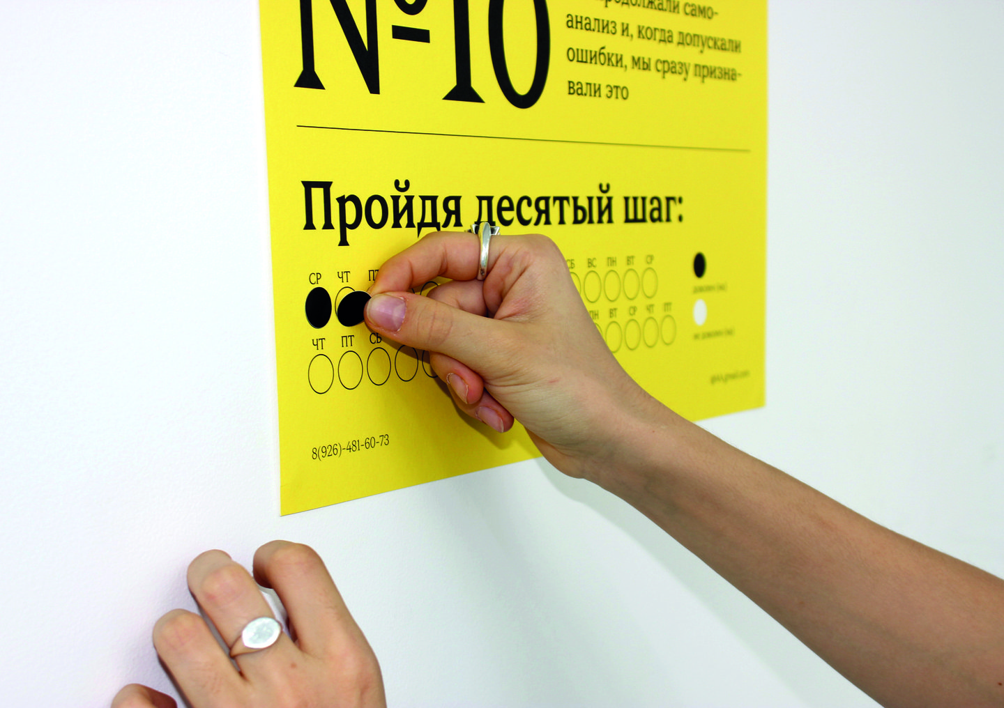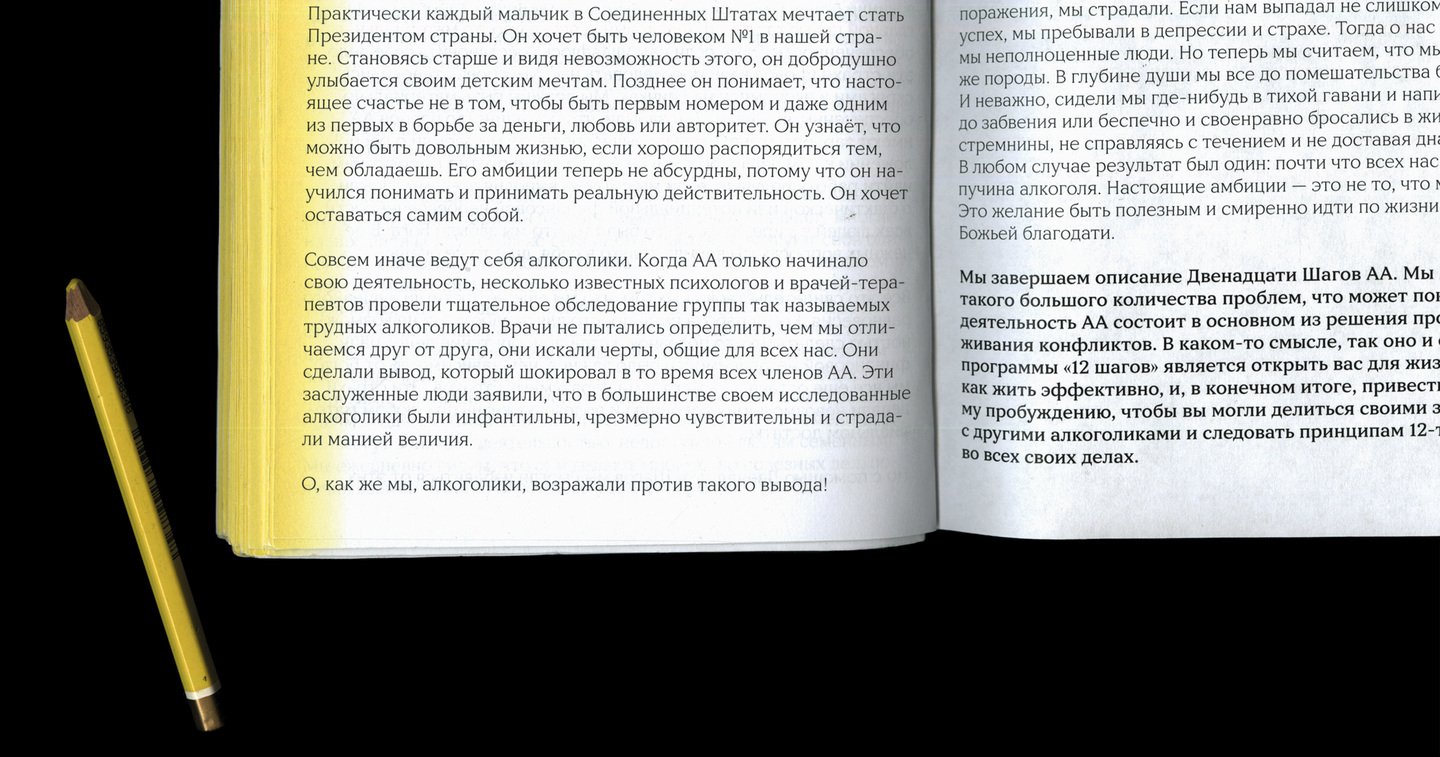 Основной опорой в течение всей работы над проектом была книга Билла Уилсона «12 Шагов». Я адаптировала ее под более функциональный формат, сделав левую ее часть информационной с текстом главной книги терапии и вопросами, а правую же часть отдала под ежедневник на год, где человек может каждый писать планы, мысли, итоги