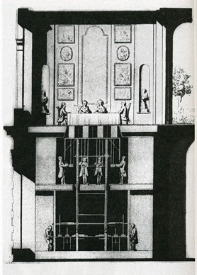 Подъемный механизм стола был довольно громоздким — он занимал большую часть первого этажа для подлого люда, в нижнем подвальном помещении движение столов обеспечивали 18 крепких слуг. Подъем стола сопровождался одновременным подъемом тарелок с помощью специальных шахт.