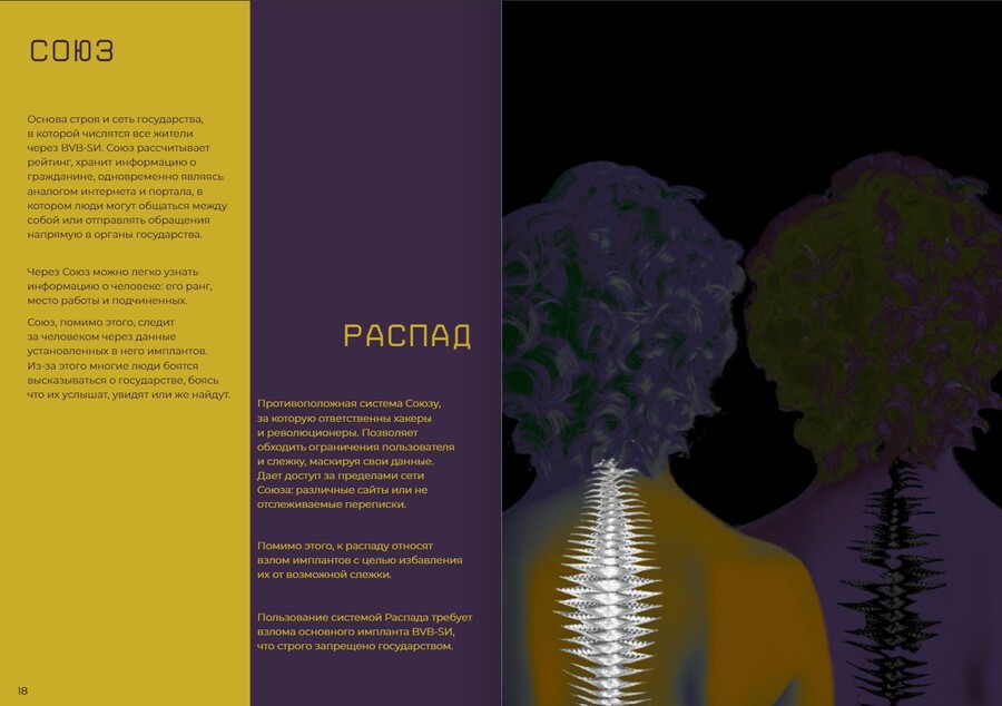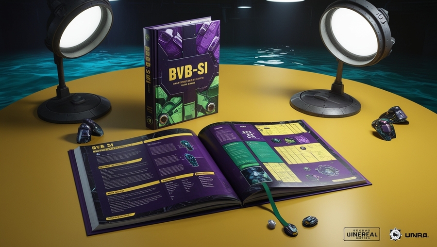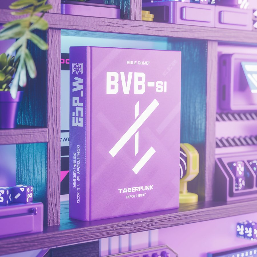 A 3D rendering of the rulebook for a tabletop role-playing game open on a table. The game takes place on a flooded planet with a totalitarian state and implants. The visual design is made in the cyberpunk style using collage themes. The game is called BVB-SI. The color scheme is dark purple, green and yellow