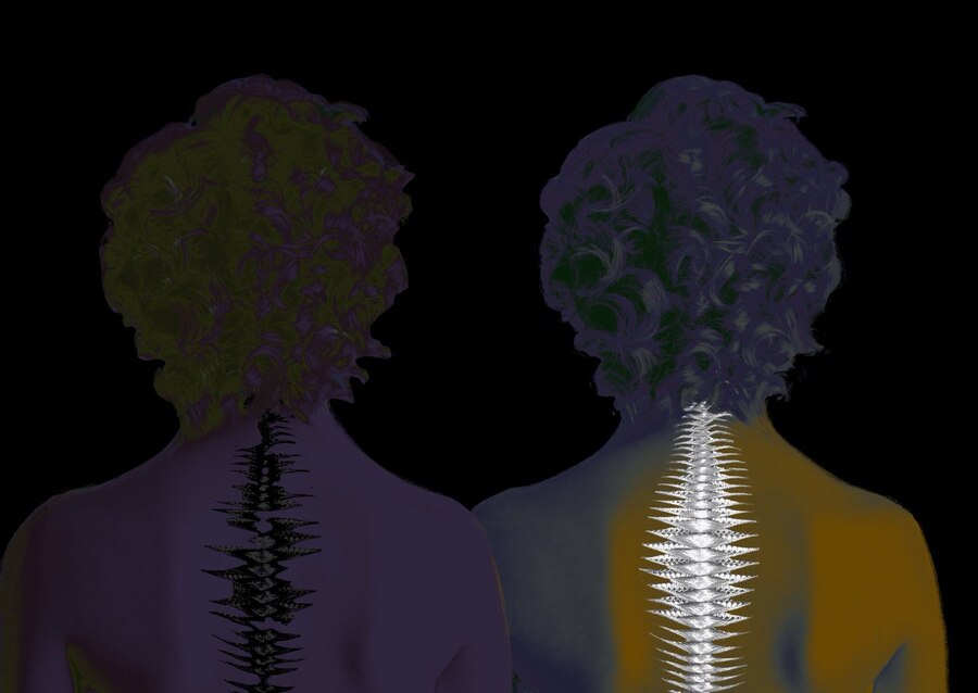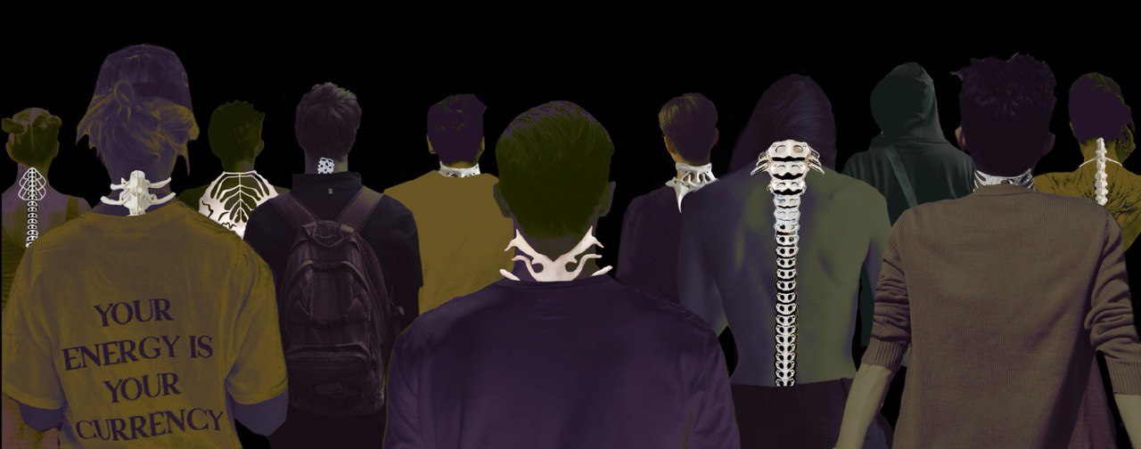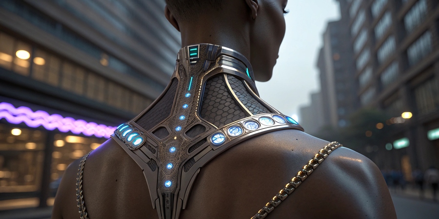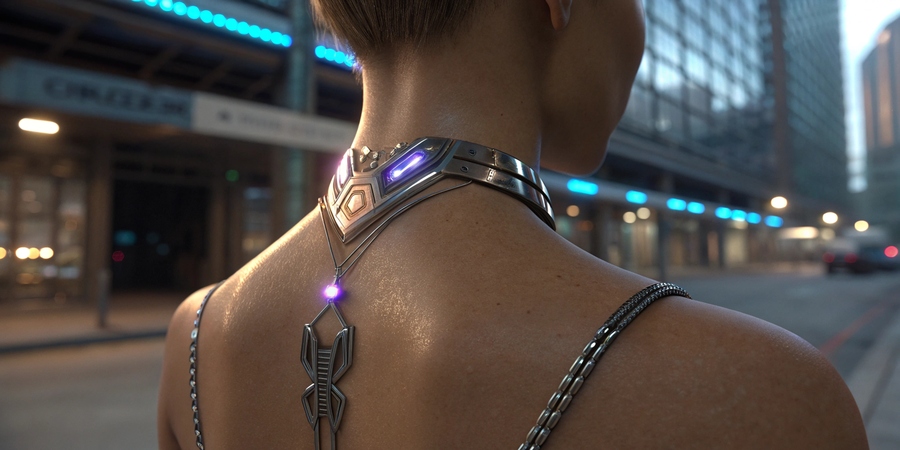 3D rendering of a jewelry on the back of the neck resembling a cyberpunk style futuristic body implant.