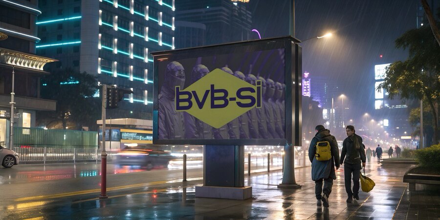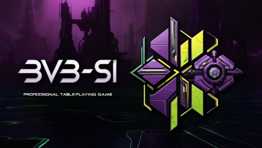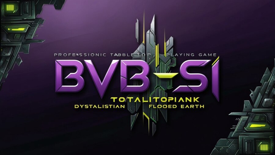 A professional, high-contrast flat vector art logo for BVB-SI, a futuristic tabletop role-playing game set in a dystopian, flooded Earth with a totalitarian government and advanced cyberpunk technologies, featuring a dark purple dominant color scheme with striking green and yellow accent hues. The modern, cutting-edge font is sleek and futuristic, with sharp, angular lines and a metallic sheen. The logo itself is composed of disparate, interconnected elements, reminiscent of cybernetic implants, assembled in a 2d collage technique to convey the themes of technology and surveillance. The vector art style is intricate, with bold lines, geometric shapes, and a sense of depth and dimensionality. The overall aesthetic is dark, gritty, and ominous, capturing the essence of a dystopian, high-tech world. But The overall silhouette is not overloaded
