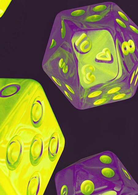 A 3D rendering of a set of dice for a cyberpunk tabletop role-playing game. The set consists of 12 faceted cubes and 20 faceted cubes. The palette is made in dark purple, green and yellow colors