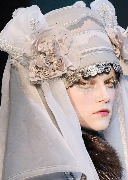 В этом разделе я рассмотрю коллекции модных домов, использующих кокошник как элемент образа, яркий аксессуар/головной убор. Это история о том, как кокошник актуализировался в наше время, нашел свое место в современной моде и покорил сердца многих людей. Отсылка к древним народным костюмам и аксессуарам — частый прием, которым пользуются дизайнеры.
