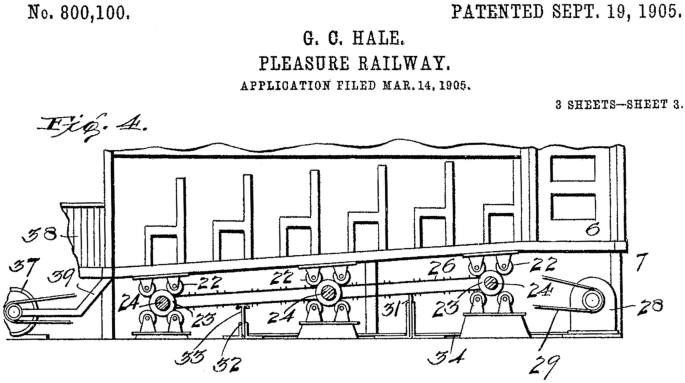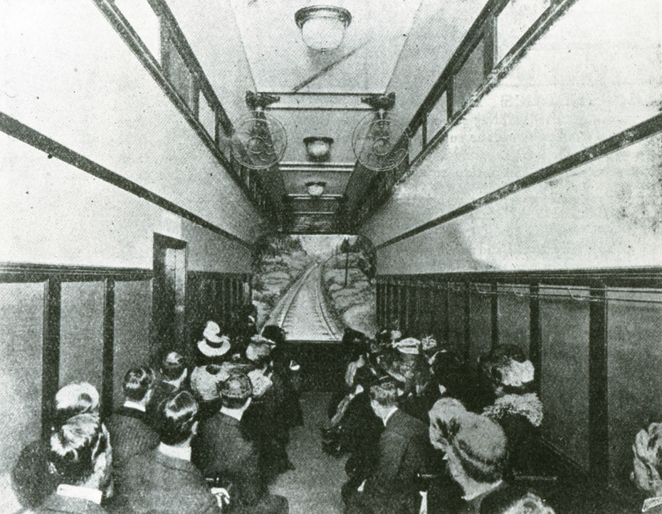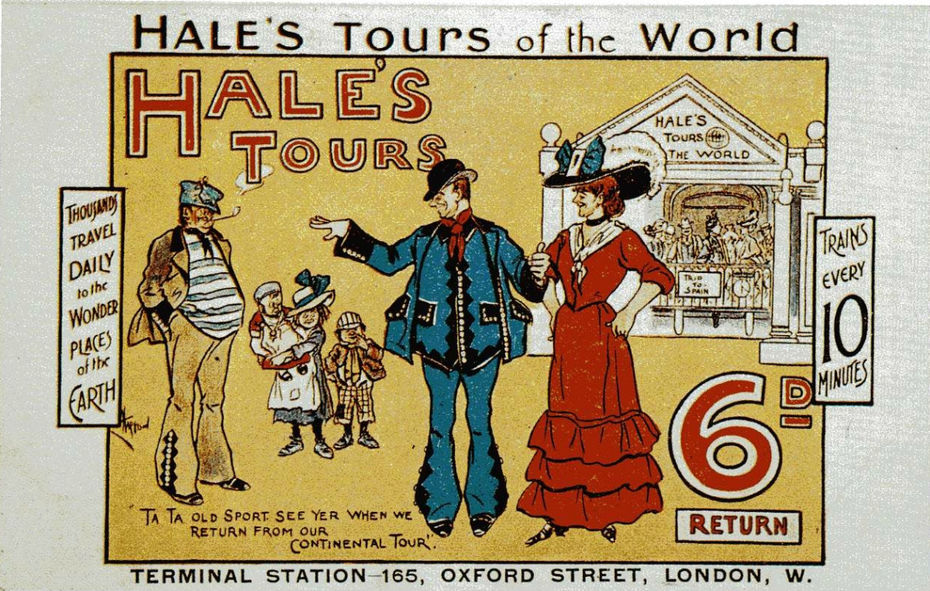 Создать с помощью раннего кино аттракцион по форме, а не только по своей сути, удалось не только Томасу Эдисону, но и другому американскому изобретателю Джорджу Хейлу, запатентовавшему в 1904 году новый вид развлечения под названием Hale’s Tours and Scenes of the World — симулятор кругосветного путешествия. Небольшое помещение имитировало железнодорожный вагон, и оборудовалось особыми механизмами, с помощью которых можно было создавать иллюзию движущегося по рельсам поезда, включая тряску, стук колес и прочие необходимые эффекты. Внутри помещения устанавливался экран, куда проецировались киноленты, снятые в разных уголках мира и демонстрирующие зрителям завораживающие виды, как если бы они видели эти пейзажи из окна поезда.