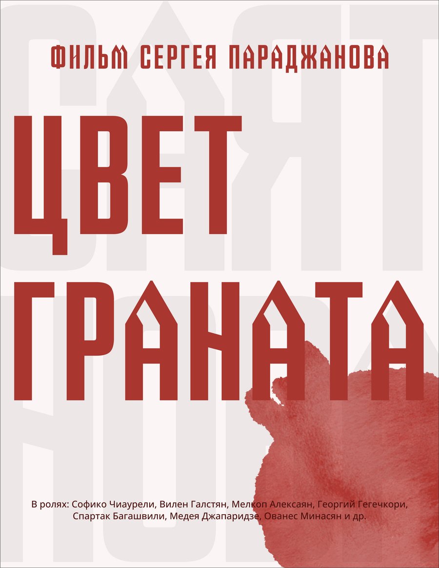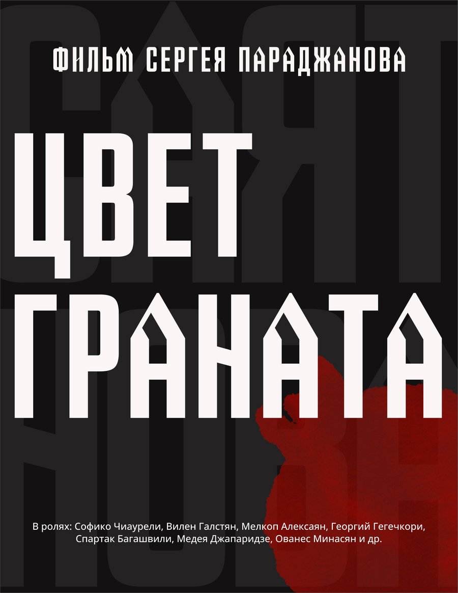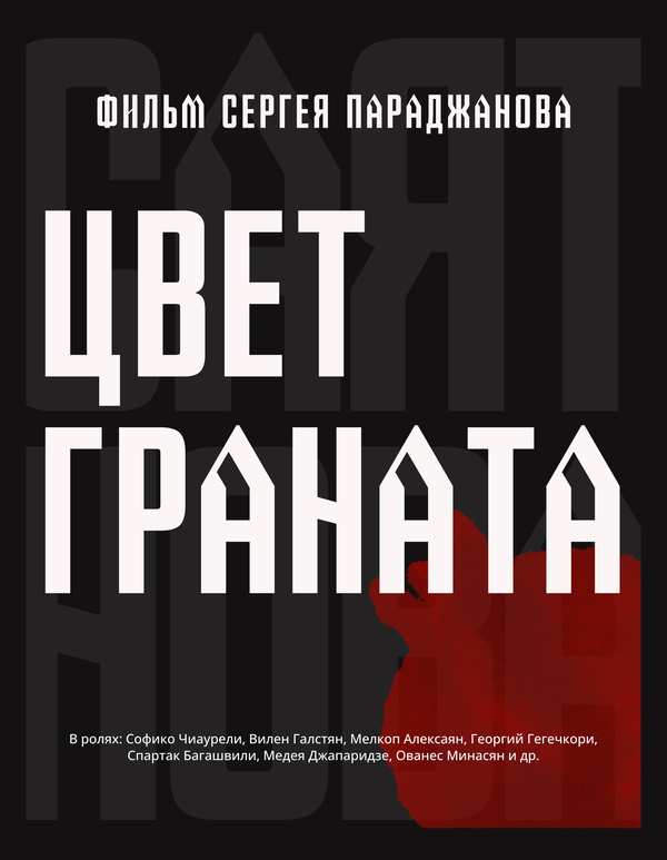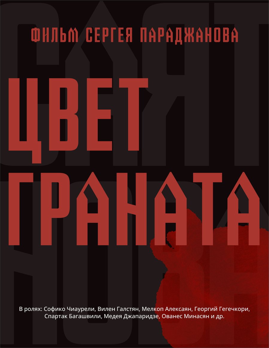 Сами афиши выполнены в минималистичном стиле, но глубокие тона, пронзительный острый шрифт, создают глубокую композицию и подчеркивают поэтичность фильма Сергея Параджанова.