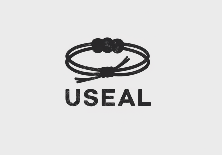 production workshop with equipment for the manufacture of bracelets with a minimalist black-and-white logo featuring a bracelet with three beads at its center, a simple knot securing the ends, and clean, bold text beneath it that reads 'USEAL' in all caps.