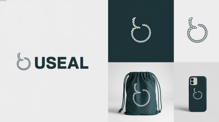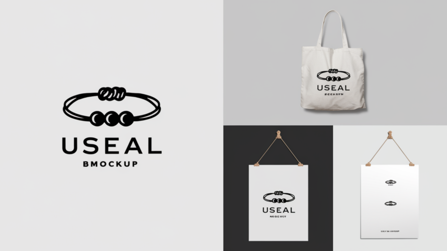 Create a branding mockup showcasing the USEAL logo applied to various products with a minimalist and elegant aesthetic. The logo features a simple bracelet design with a knot and beads, accompanied by modern, sleek typography. Include the following items: