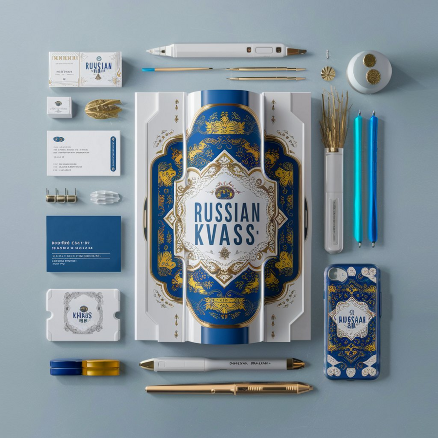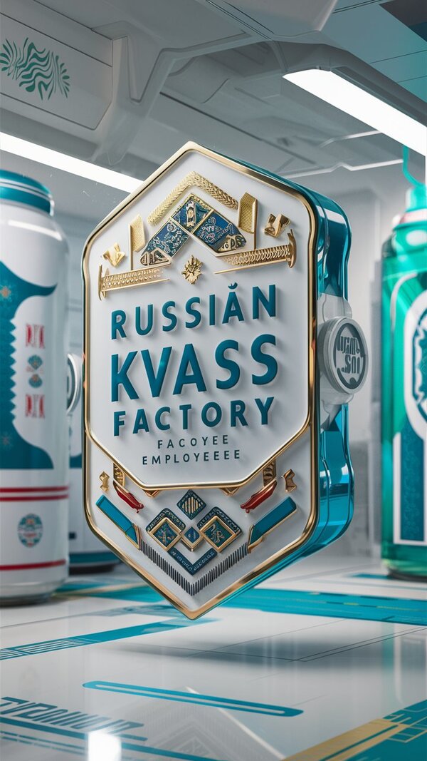 promt: branding for the Russian Kvass product plant company, which develops a futuristic and innovative home-made kvass kit, showcasing an elegant and smart kit with a distinctly Russian identity. The branding uses elements of Russian culture, such as intricate patterns and bright colors. The general atmosphere of the image is cleanliness, high technology and triumph of Russian culture and traditions. Main colors: white, blue, gold