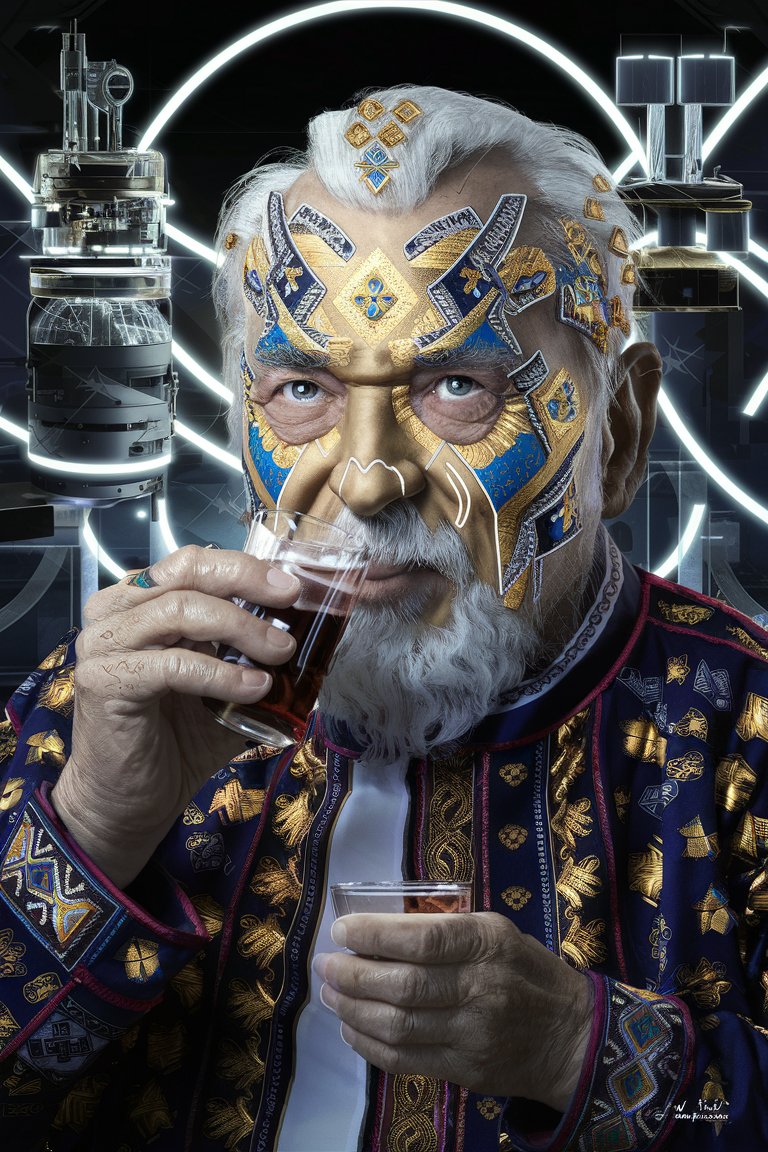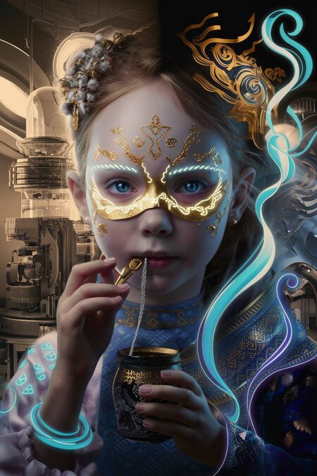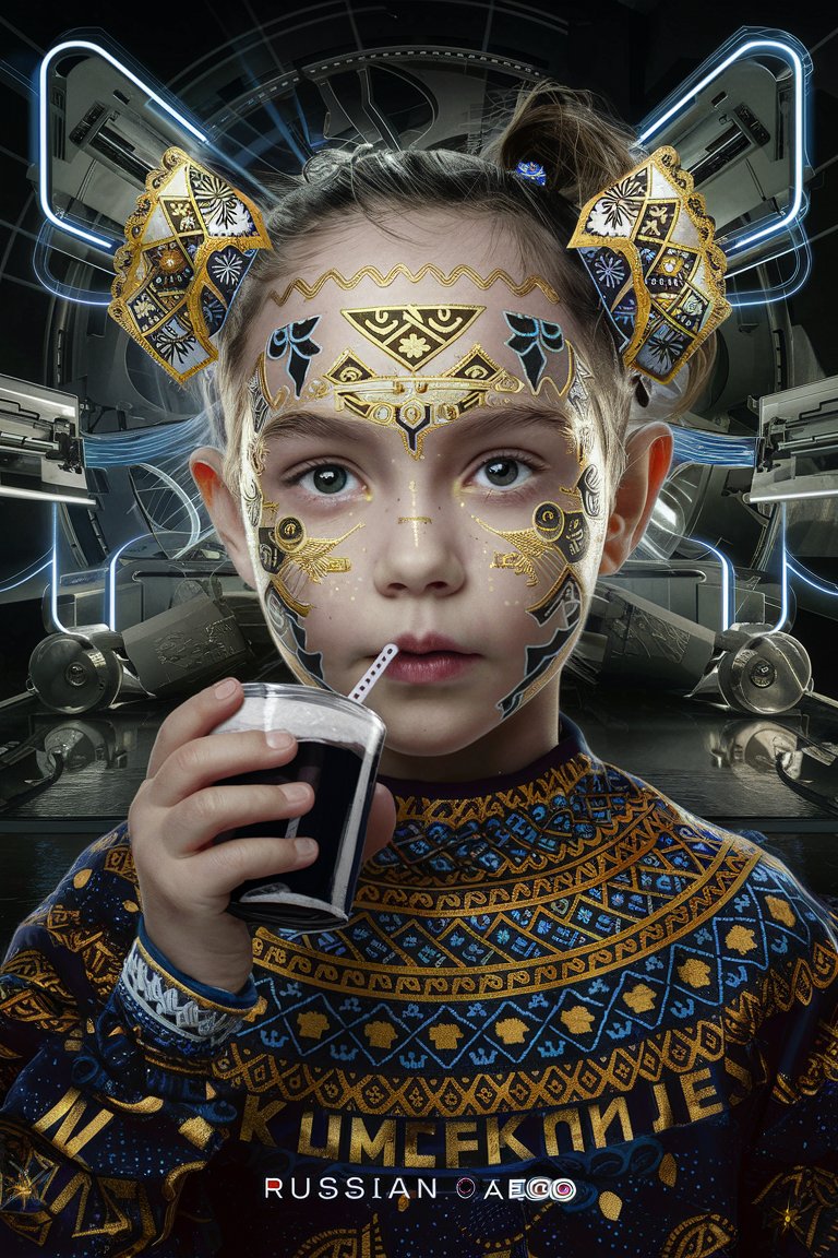 promt: a stunning contemporary portrait of a young girl decorated with traditional Russian patterns. Her face is rendered in a unique blend of technology and folklore, and the digital background features modern machinery and luminous patterns. The patterns on her face incorporate elements of Russian culture, such as intricate patterns and gold, neon blue and white colors. The overall effect is a fusion of the ancient and the futuristic, showing the girl’s connection to her heritage and embrace of the modern world. She also drinks traditional Russian kvass. The main colors are gold, neon blue and white.